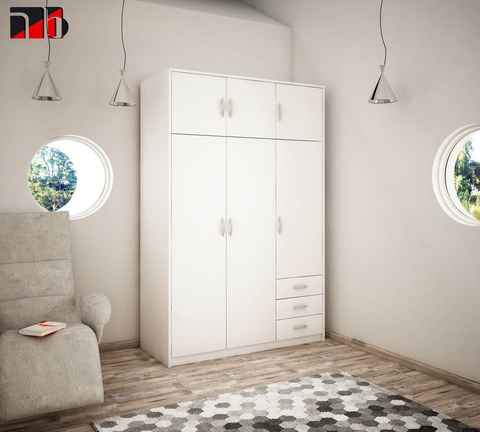 Mebel charakteryzuje się prostą, geometryczną formą i matowym wykończenie, co sprawia, że idealnie wpisuje się w nowoczesne, skandynawskie oraz klasyczne aranżacje. Dodatkowym atutem jest zastosowanie technologii soft (zaokrąglona przednia krawędź), która nadaje szafie subtelności i zwiększa bezpieczeństwo użytkowania.