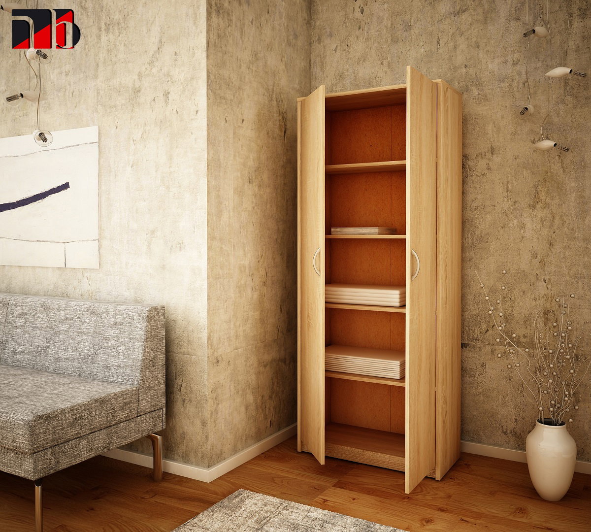 Model wyposażony jest w dwoje drzwi, za którymi znajdują się cztery funkcjonalne półki. Takie rozwiązanie pozwala wygodnie przechowywać zarówno ubrania, dokumenty, jak i inne domowe przedmioty, jednocześnie chroniąc je przed kurzem.