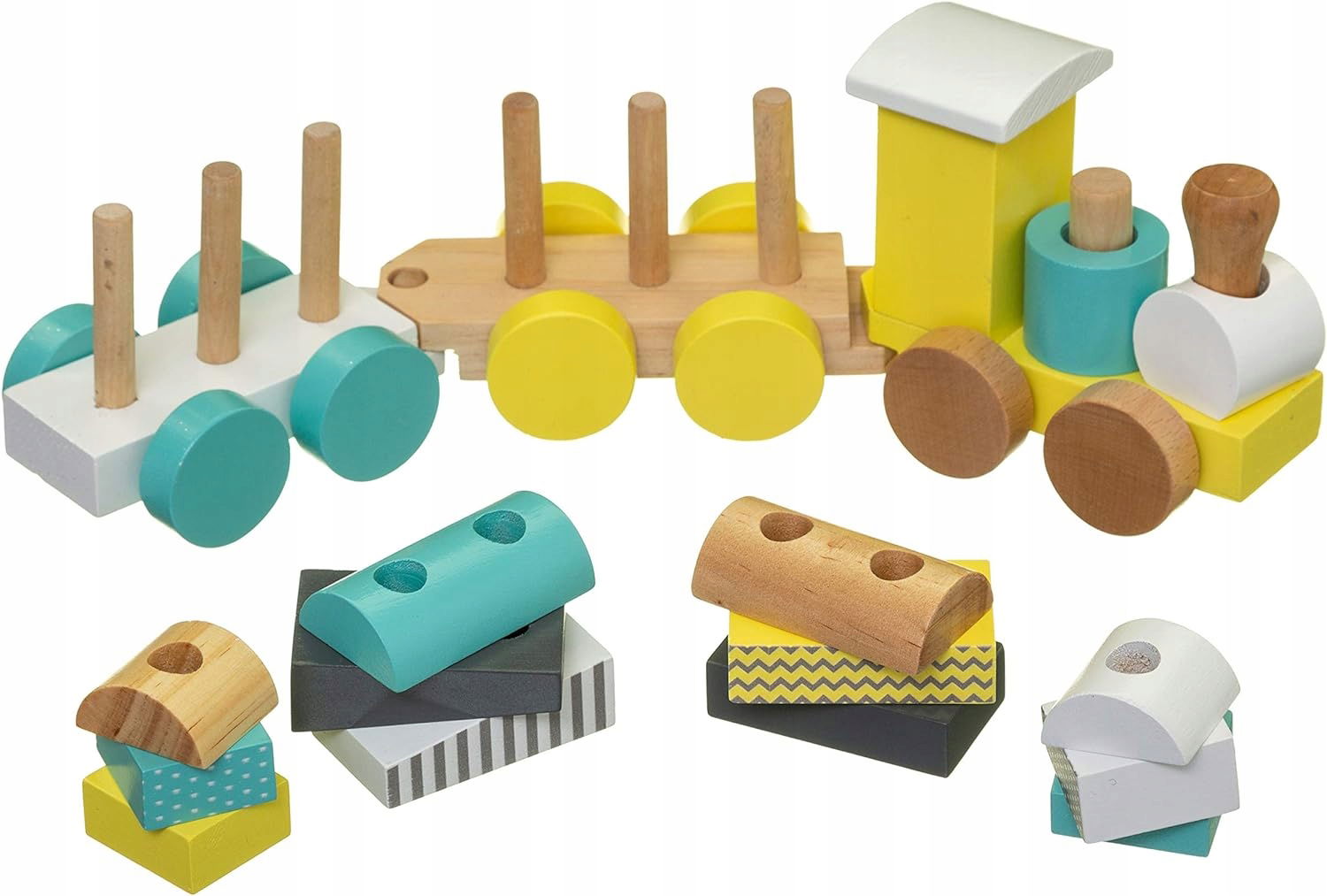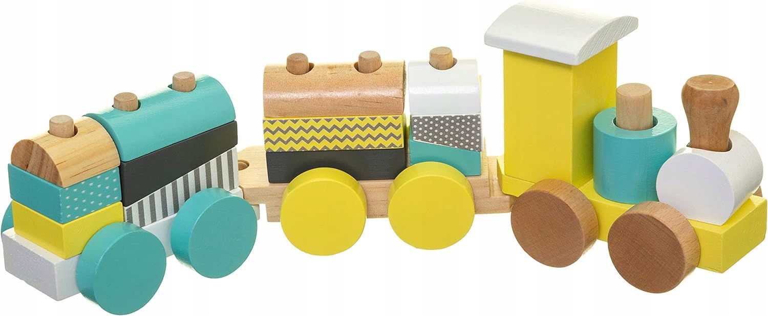 Dzięki temu pięknemu drewnianemu pociągowi dziecko będzie długo bawić się – będzie w stanie układać, budować i wyburzyć swoje konstrukcje dzięki różnym blokom, które są genialnie ułożone na lokomotywie i obydwu wagonach. Zestaw zawiera lokomotywę, 2 wagony i 14 bloków.