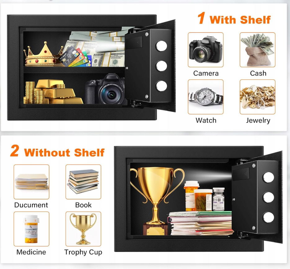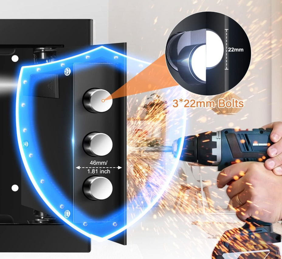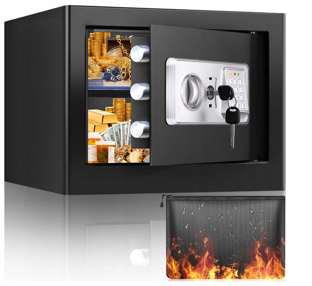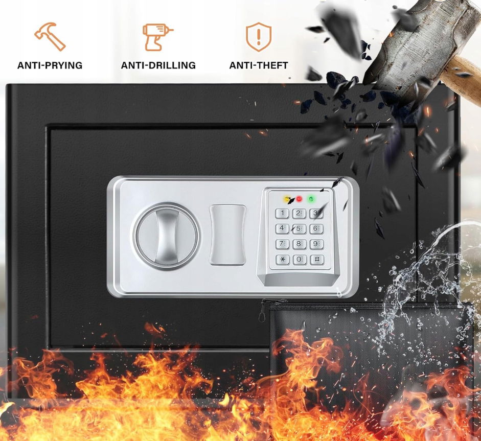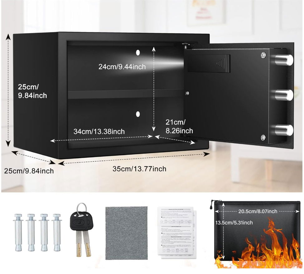 - ✴️Sejf domowy i ognioodporna torba na pieniądze - bezpieczny sejf jest wykonany z wytrzymałej stali walcowanej na zimno o dobrej odporności na podważanie, wiercenie i wysokie temperatury. Sejf meblowy jest wyposażony w trzy bolce 22 mm i drzwi wejściowe o grubości 46 mm. Można używać sejfu do przechowywania gotówki, biżuterii, lekarstw, z dala od ciekawskich dzieci lub złodziei. Oferujemy również ognioodporny wodoszczelny portfel i matę, aby dodatkowo chronić wartościowe przedmioty.
