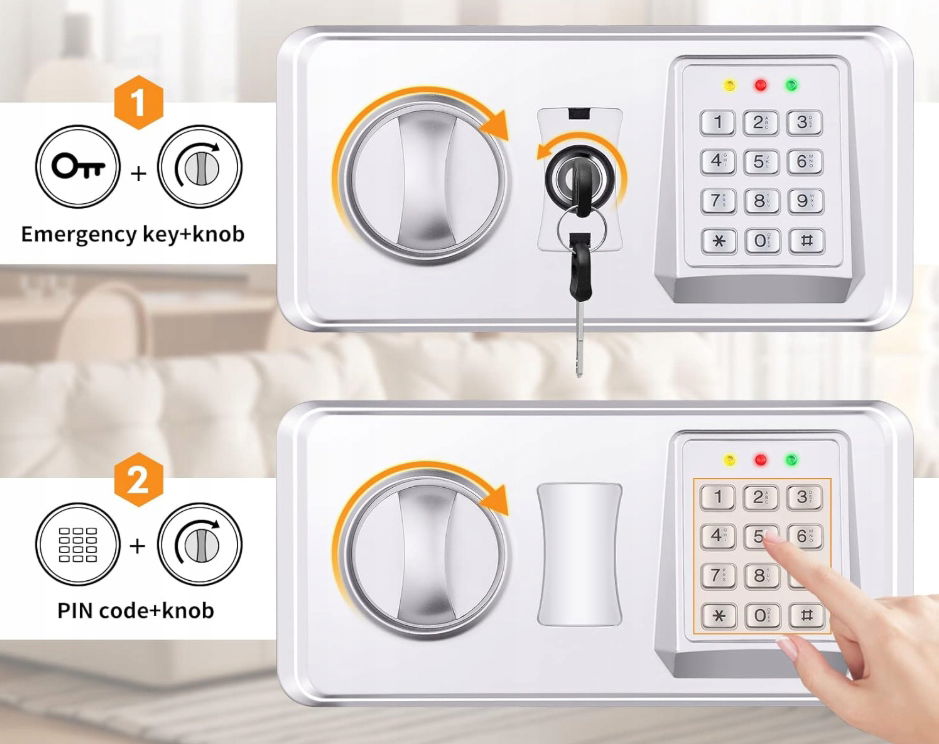 - ✴️System alarmowy i tryb cichy - hasło jest wprowadzane niepoprawnie 3 razy z rzędu, a sejf emituje dźwięk ostrzegawczy przez 20 sekund. Podczas dźwięku ostrzegawczego klawiatura zostanie wyłączona. Cyfrowe sejfy doskonale nadają się do ochrony wartościowych przedmiotów i prywatności. Można nacisnąć "*633", aby wyłączyć dźwięk, i "*66", aby włączyć dźwięk. Możesz podarować sejf jako prezent dla przyjaciół, rodziców i bliskich.