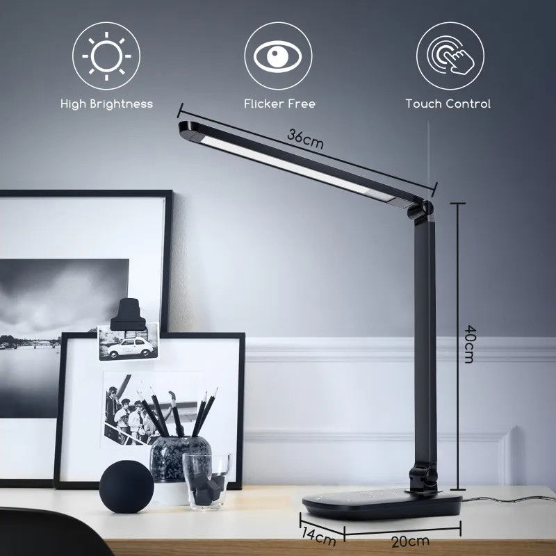 - Opis produktu: Obsługuje inteligentne ładowanie bezprzewodowe; krótkie dotknięcie pozwala na ściemnianie w czterech stopniach, długie dotknięcie pozwala na ściemnianie bezstopniowe; możliwość wyboru 5 temperatur barwowych; obrotowa regulacja uchwytu lampy pod wieloma kątami, łatwa do złożenia; z portem USB