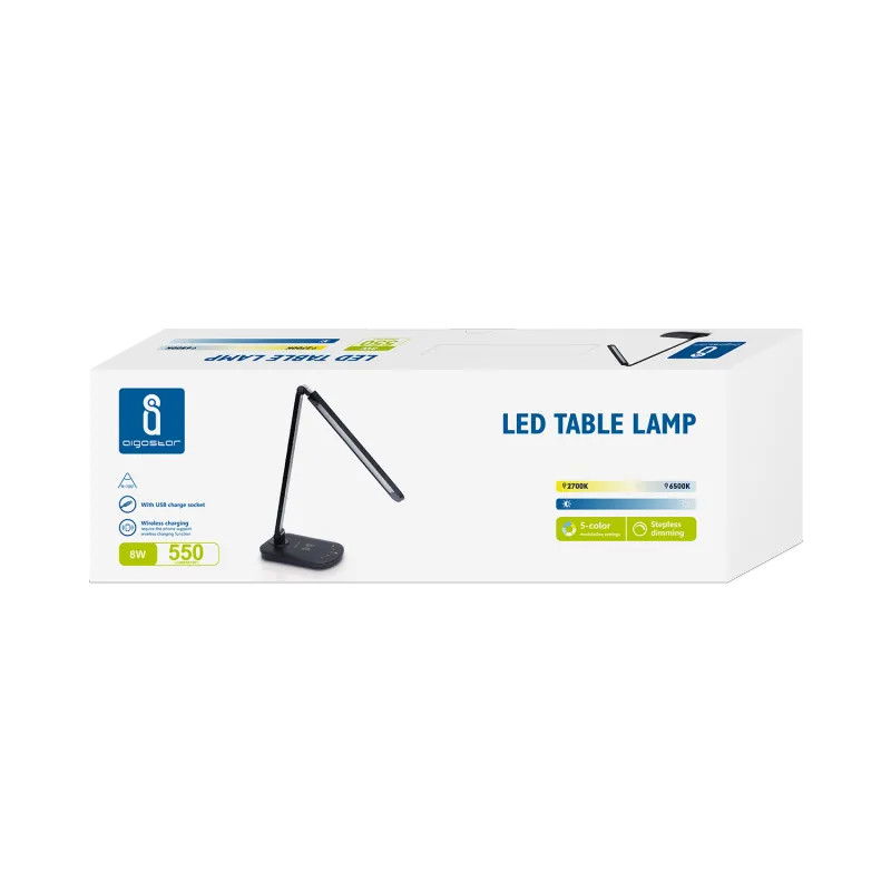 Obsługuje inteligentne ładowanie bezprzewodowe. krótkie dotknięcie pozwala na ściemnianie w czterech stopniach, długie dotknięcie pozwala na ściemnianie bezstopniowe. możliwość wyboru 5 temperatur barwowych. obrotowa regulacja uchwytu lampy pod wieloma kątami, łatwa do złożenia. z portem USB