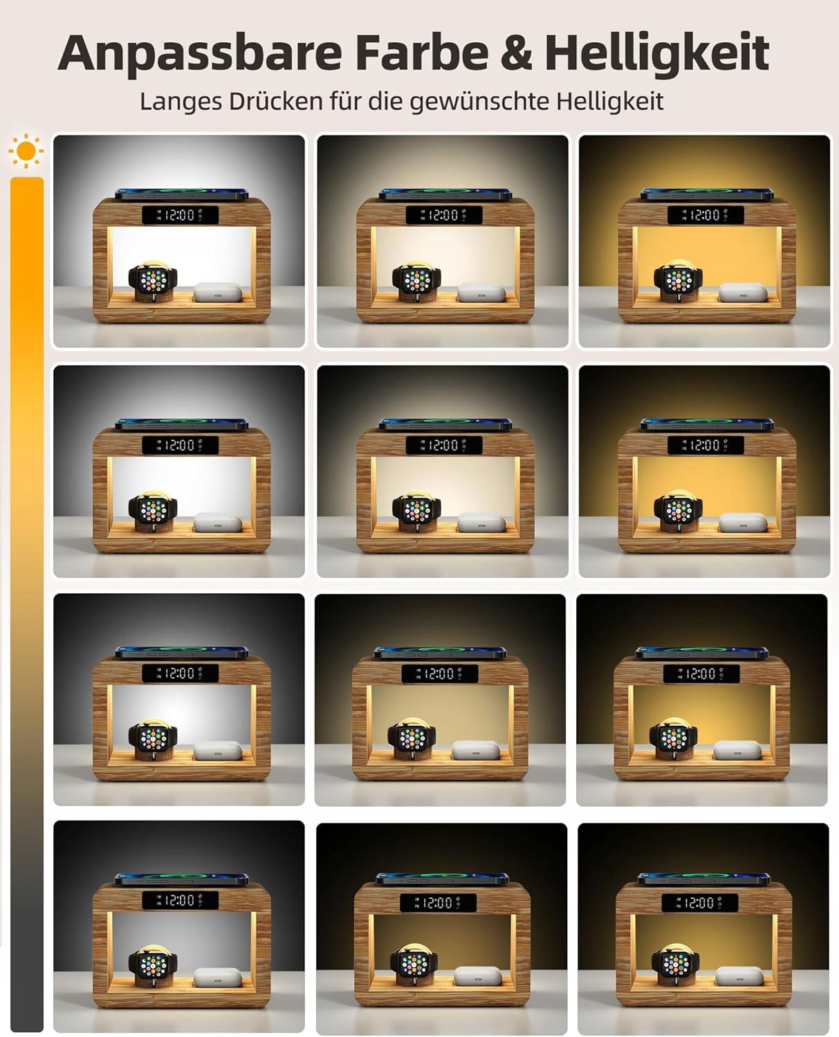 - Bezprzewodowa stacja ładująca 3 w 1 z budzikiem i lampką nocną - Masz dość splątanych kabli i bałaganu? Nasza innowacyjna bezprzewodowa stacja ładująca łączy w sobie budzik, regulowaną lampkę nocną (z 3 opcjami koloru), bezprzewodową ładowarkę do telefonu komórkowego, ładowarkę AirPods i ładowarkę do zegarka Apple Watch.