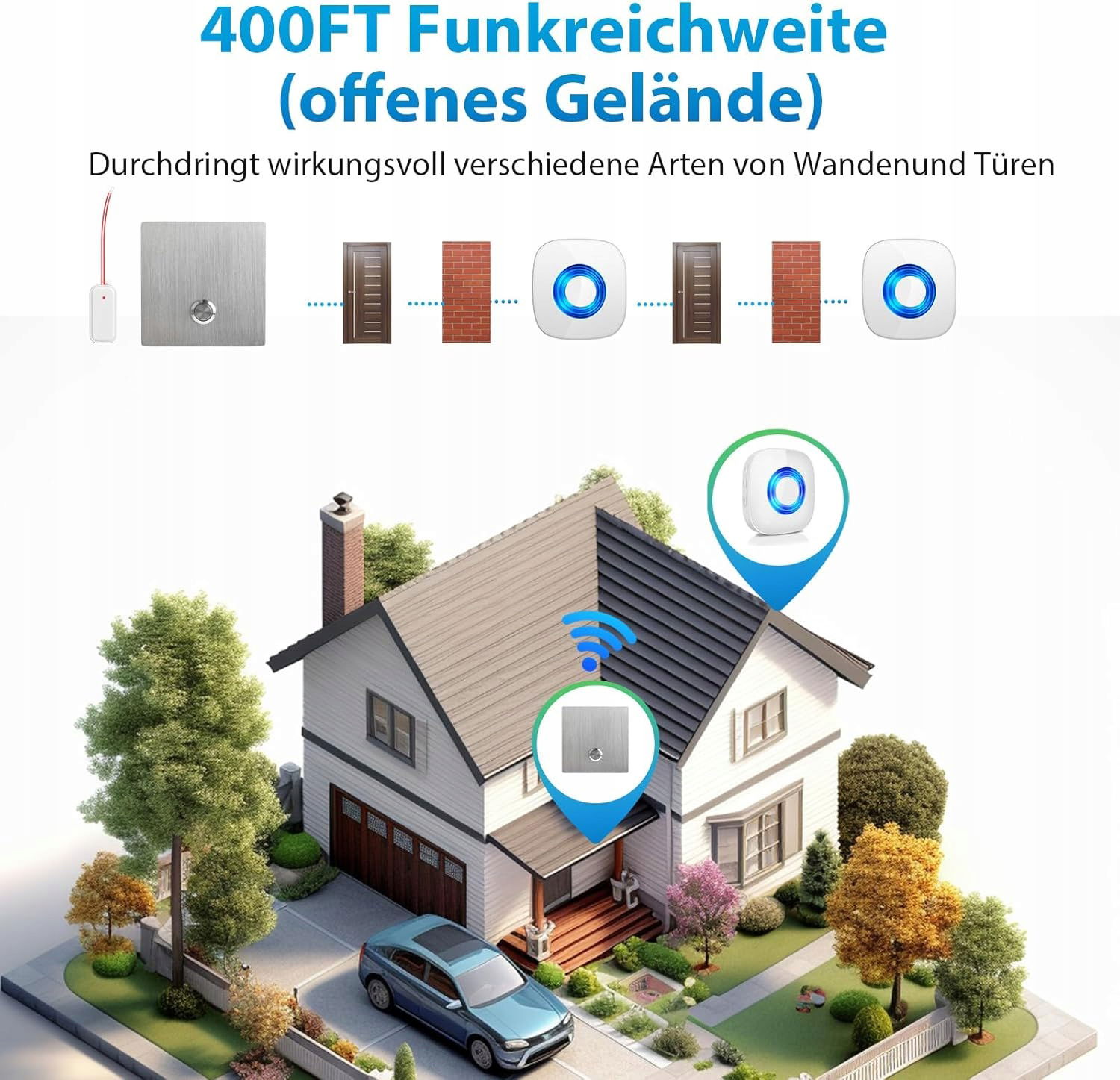 Uniwersalny dzwonek bezprzewodowy PHYSEN dla wszystkich sygnałów radiowych z 58 melodiami polifonicznymi i sygnałem optycznym LED oraz 5 poziomami głośności (0-110 dB).