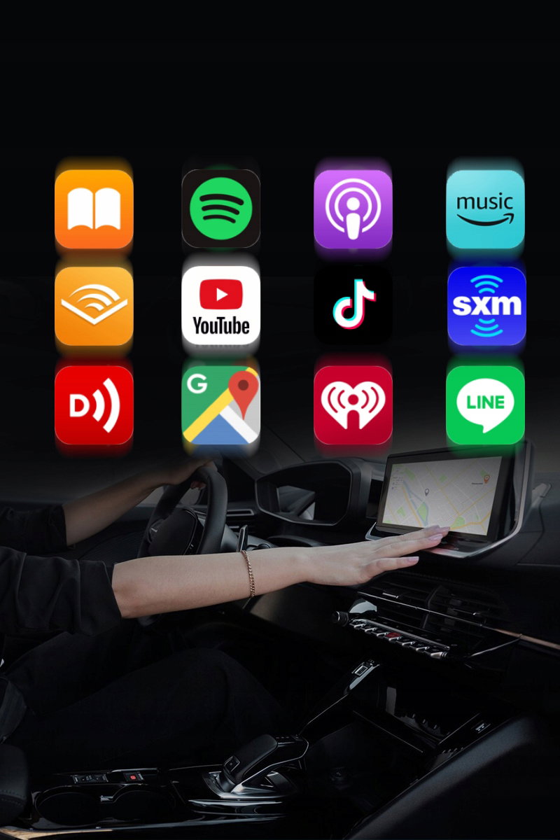 - Korzystaj z aplikacji: Teraz możesz bezprzewodowo korzystać z aplikacji, takich jak mapy, muzyka, wiadomości, telefon i wiele innych, sterując nimi za pomocą ekranu dotykowego, głosu lub przycisków na kierownicy.