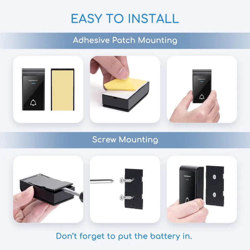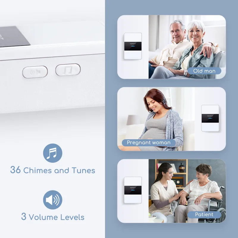 Elegancki styl Nowe wrażenia. Bezprzewodowa konstrukcja. Wyśmienity wygląd. 3 poziomy głośności, 36 dzwonków. Transmisja na odległość do 150 m. Wodoodporna konstrukcja. Wiele funkcji. Dzwonek to szczegół, którego nie można zignorować w dekoracji domu i to on jest pierwszym wrażeniem gości podczas wizyty. Nowy bezprzewodowy dzwonek do drzwi o doskonałej wydajności, eleganckim wyglądzie, przełamujący tradycyjne ograniczenia dzwonka do drzwi, brak sieci, brak problemów z okablowaniem, zapewnia nowe wrażenia z użytkowania. dla konsumentów. Odbiór bezprzewodowy, brak okablowania mogącego uszkodzić ścianę, klej z tyłu, łatwy w montażu, wystarczy kliknąć lekko, aby zadzwonić. Użyj panelu akrylowego, lekki w dotyku, prosty i modny, łuk w czterech rogach, więcej łagodny i elegancki. Już nie monotonne i sztywne, pierścień i głośność można dowolnie wybierać i regulować, czysty i dźwięczny dźwięk, piękne dzwonki. Silna penetracja, silne przeciwdziałanie zakłóceniom, otwarta przestrzeń, odległość w linii prostej w górę do 150 metrów, całkowicie spełniają wymagania użytku domowego. Wyjątkowa wodoodporność IP44, nie zawiedzie na działanie słońca i deszczu. To nie tylko dzwonek do drzwi, ale także pager, mały rozmiar z dużymi funkcjami, jeden przycisk telefon, wygodny do opieki nad członkami rodziny, osobami starszymi/chorymi/kobietami w ciąży. 1-Korzystając z dzwonka, staraj się używać wysokiej jakości baterii alkalicznych, aby uniknąć zwykłych baterii węglowych o krótkiej żywotności i łatwym wycieku elektrolitu. 2-Nie używaj dzwonka do drzwi w środowisku o wysokiej temperaturze powyżej 60 ℃.