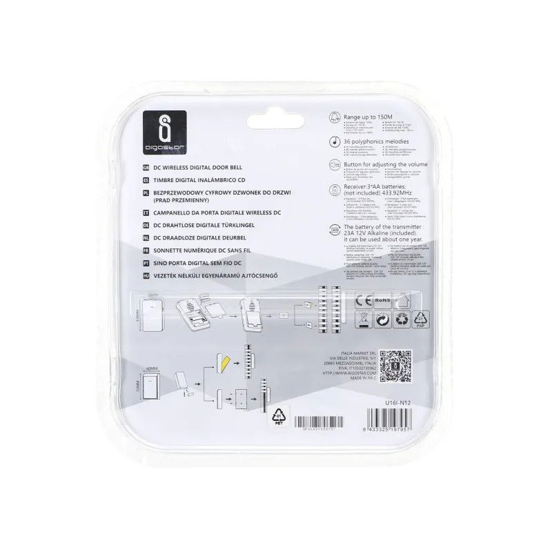 - Opis produktu: Jako pierwsi na rynku zastosowaliśmy panele akrylowe;Super długa odległość sterowania 150 m;Doskonała wodoodporność IP44;36 melodii polifonicznych;Bateria nadajnika: 23A 12V alkaliczna (w zestawie)