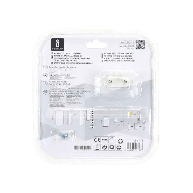 - Opis produktu: Jako pierwsi na rynku zastosowaliśmy panele akrylowe;Super długa odległość sterowania 150 m;Doskonała wodoodporność IP44;36 melodii polifonicznych;Bateria nadajnika: 23A 12V alkaliczna (w zestawie)