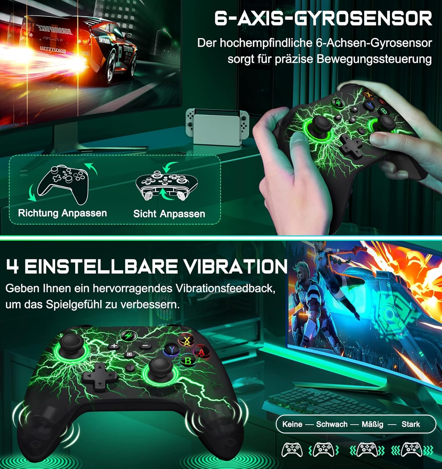 Precyzyjne sterowanie ruchem i 18 godzin gry: sterowanie ruchem działa idealnie, 6-osiowy żyroskop, precyzyjne sterowanie ruchem, idealne do gier wyścigowych. Z w pełni naładowaną baterią 1000 mAh możesz grać przez około 18 godzin. Dodatkowa funkcja automatycznego wyłączania po 5 minutach bezczynności zapobiega przypadkowemu rozładowaniu baterii.