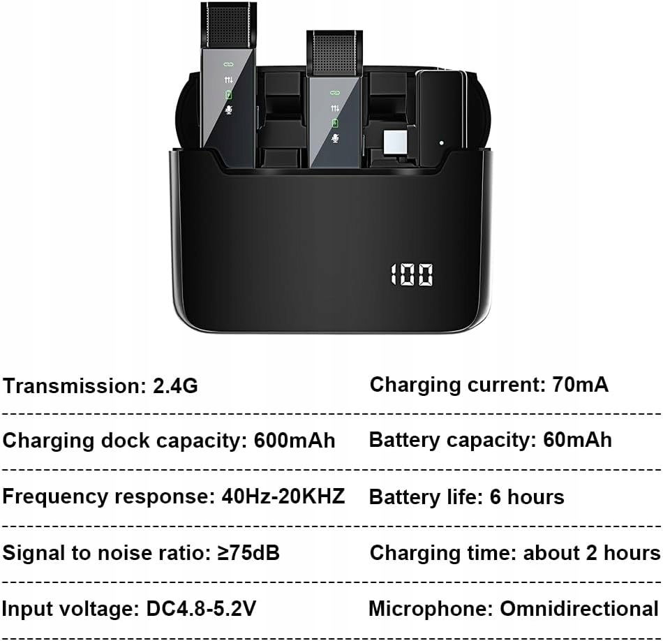 【Odbiornik z interfejsem typu C】: Odbiornik mikrofonu Lavalier wykorzystuje interfejs typu C, oferując prostotę plug-and-play. Mikrofon przypinany ma wbudowaną baterię litową 60 mAh, która po pełnym naładowaniu może pracować przez około 6 godzin. Posiada również wyświetlacz stanu mikrofonu, wyraźnie pokazujący połączenie, pogłos, baterię i tryb wyciszenia.