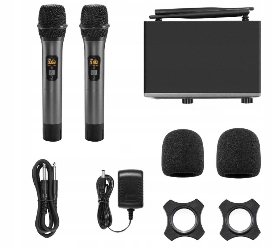- W zestawie:2 x mikrofon ręczny, 1 x odbiornik, 2 x pierścień antypoślizgowy, 1 x kabel audio 6,35 mm, 2 x osłona mikrofonu