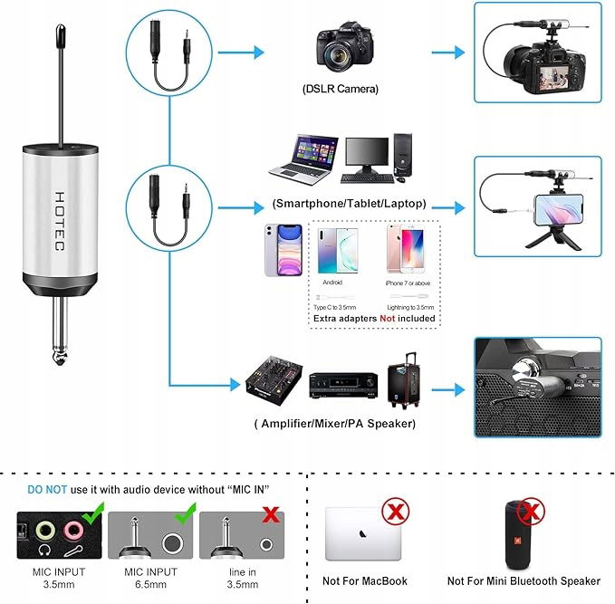 W pełni kompatybilny: Ten bezprzewodowy odbiornik jest wyposażony w uniwersalną wtyczkę 1/4”, zapewniającą bezproblemową integrację z mikserami, głośnikami PA i maszynami karaoke wyposażonymi w gniazdo 1/4" MIC IN, idealne do wzmacniania głosu. Ponadto jest kompatybilny z telefonami, laptopami i aparatami DSLR (dołączony adapter), oferując wszechstronne rozwiązanie do celów nagrywania.