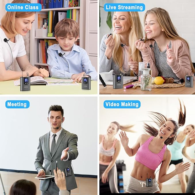ŁATWA KONFIGURACJA: Podłącz i graj, zasilany akumulatorami, wybierz mikrofon krawatowy lub słuchawkowy i podłącz go do gniazda mikrofonu nadajnika, włącz oba, i gotowe.