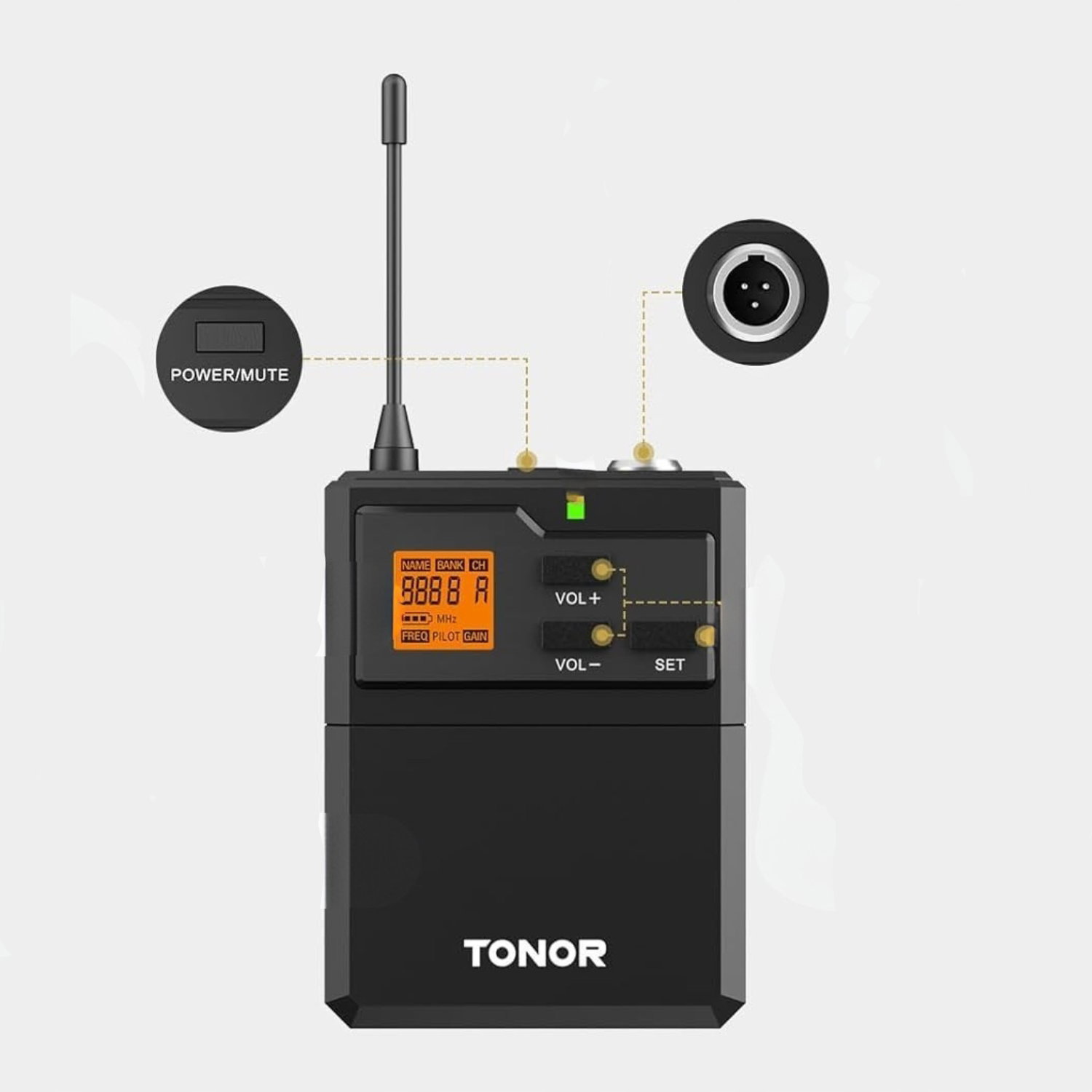 - Nadajniki bodypack – wygoda i kontrola: nadajniki bodypack są wyposażone w wyświetlacz LCD, który pokazuje częstotliwość oraz poziom baterii. Umożliwiają regulację głośności, szybkie wyciszenie (MUTE) oraz wybór kanału, co daje pełną kontrolę podczas pracy. Zasilanie odbywa się za pomocą 2 baterii AA na każdy bodypack, co ułatwia szybkie przygotowanie zestawu do użycia.