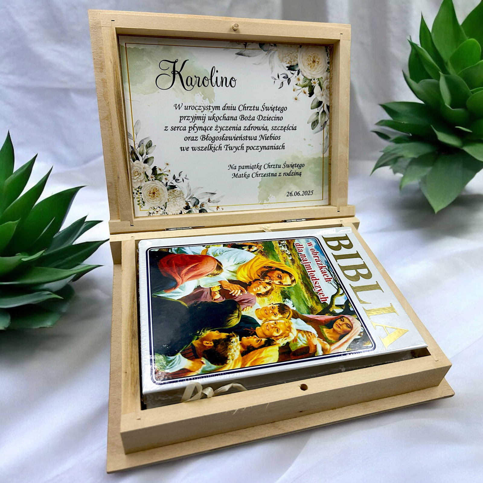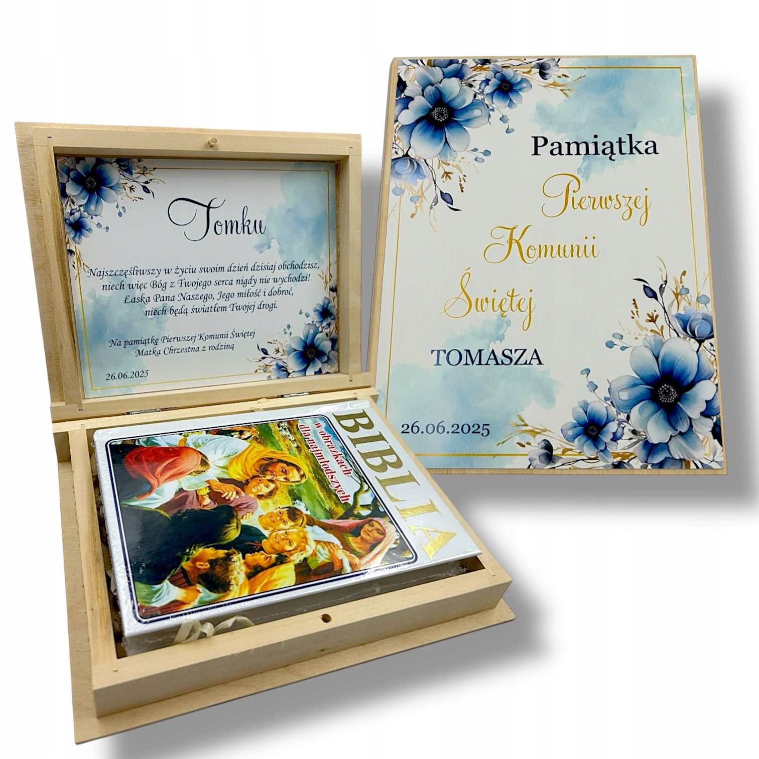 Oferujemy biblię w szkatułce ze spersonalizowanym nadrukiem. To upominek, który zostanie w pamięci na długi czas a estetycznie wykonana szkatułka będzie stanowiła piękną ozdobę na długie lata.