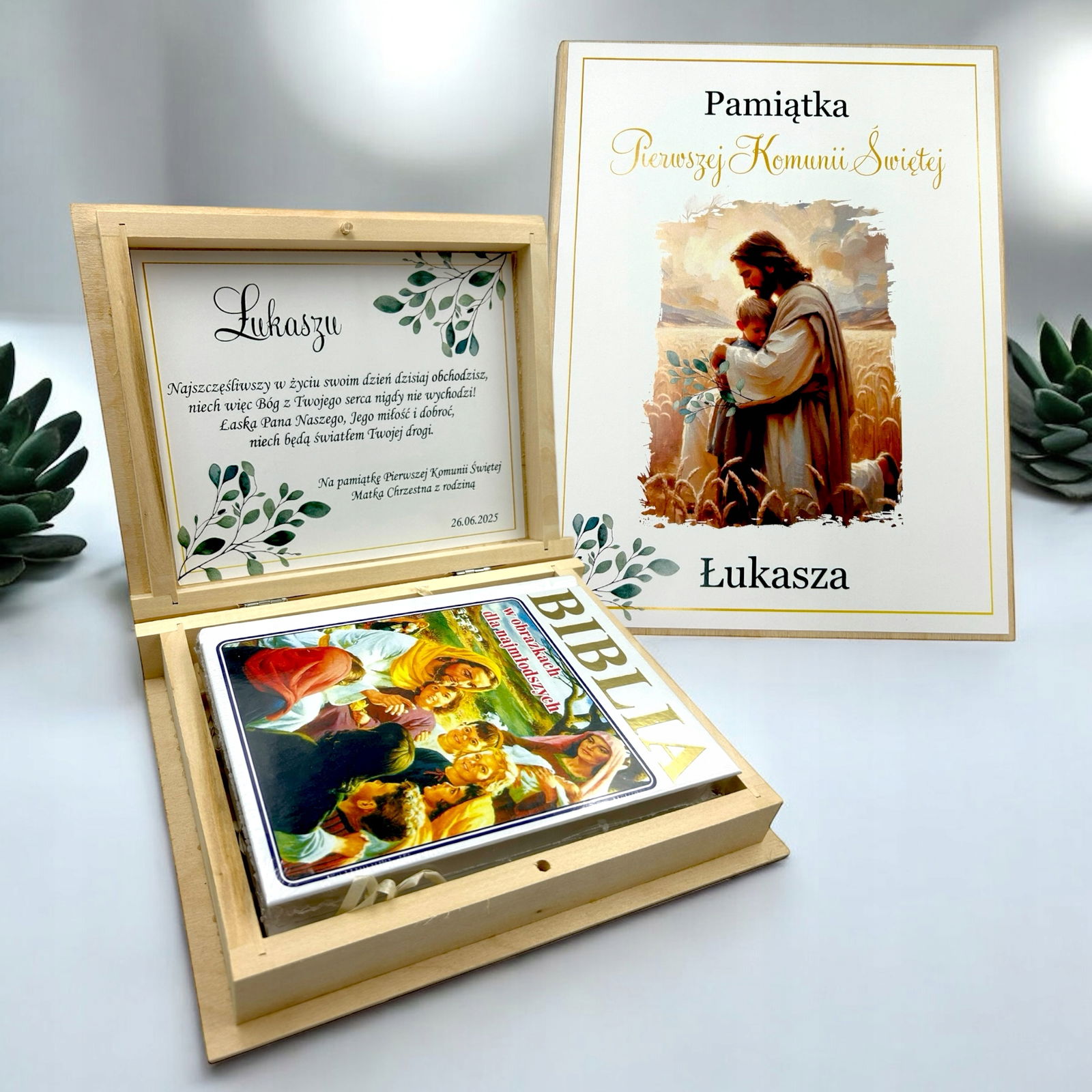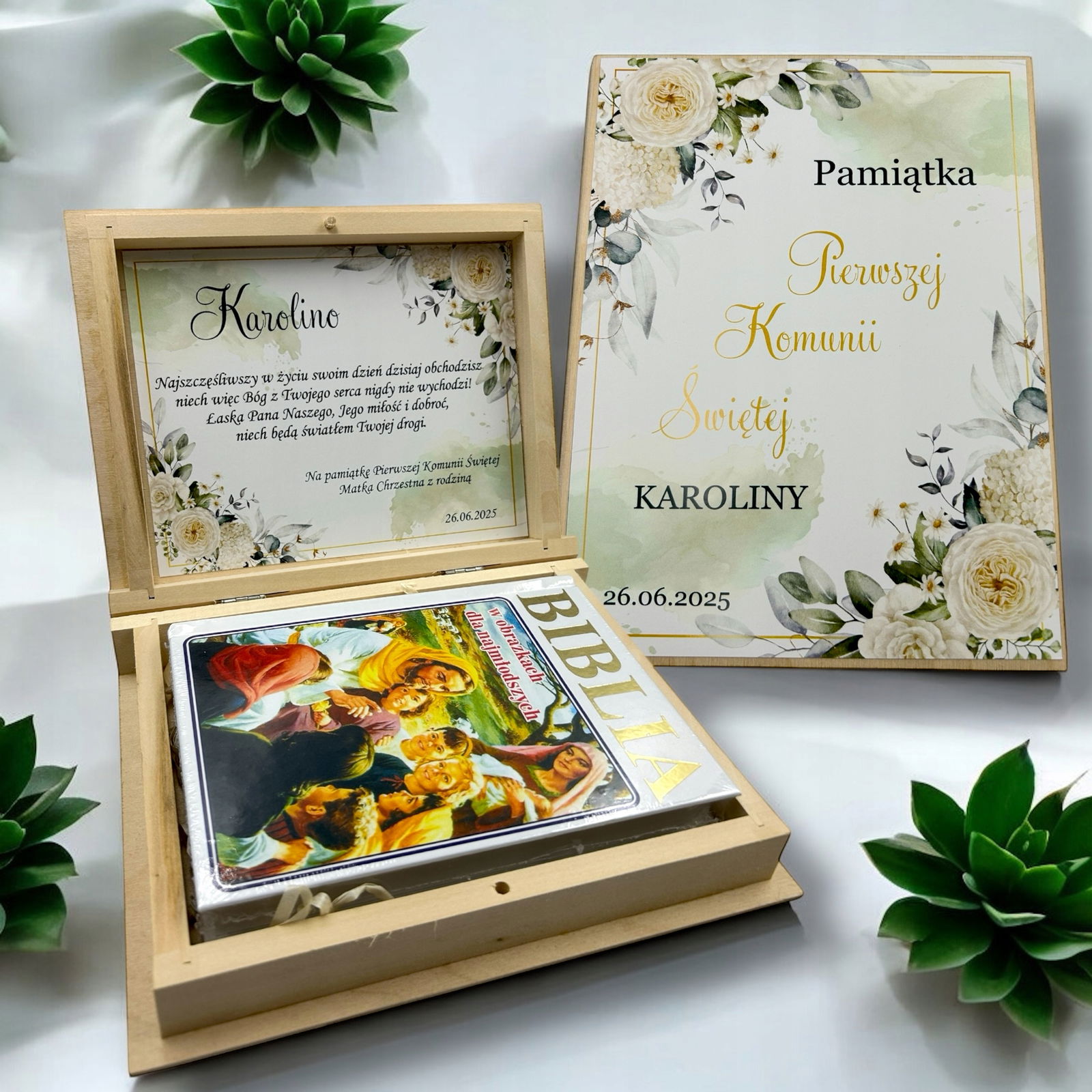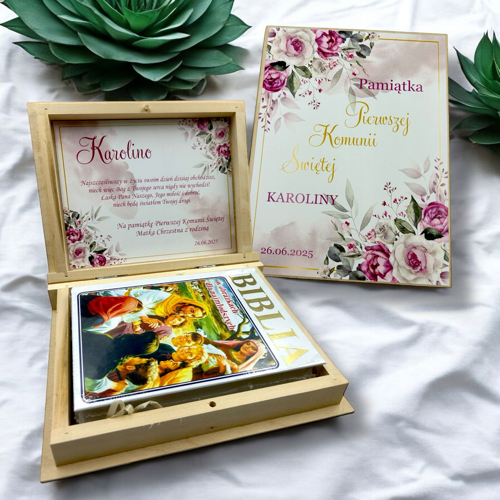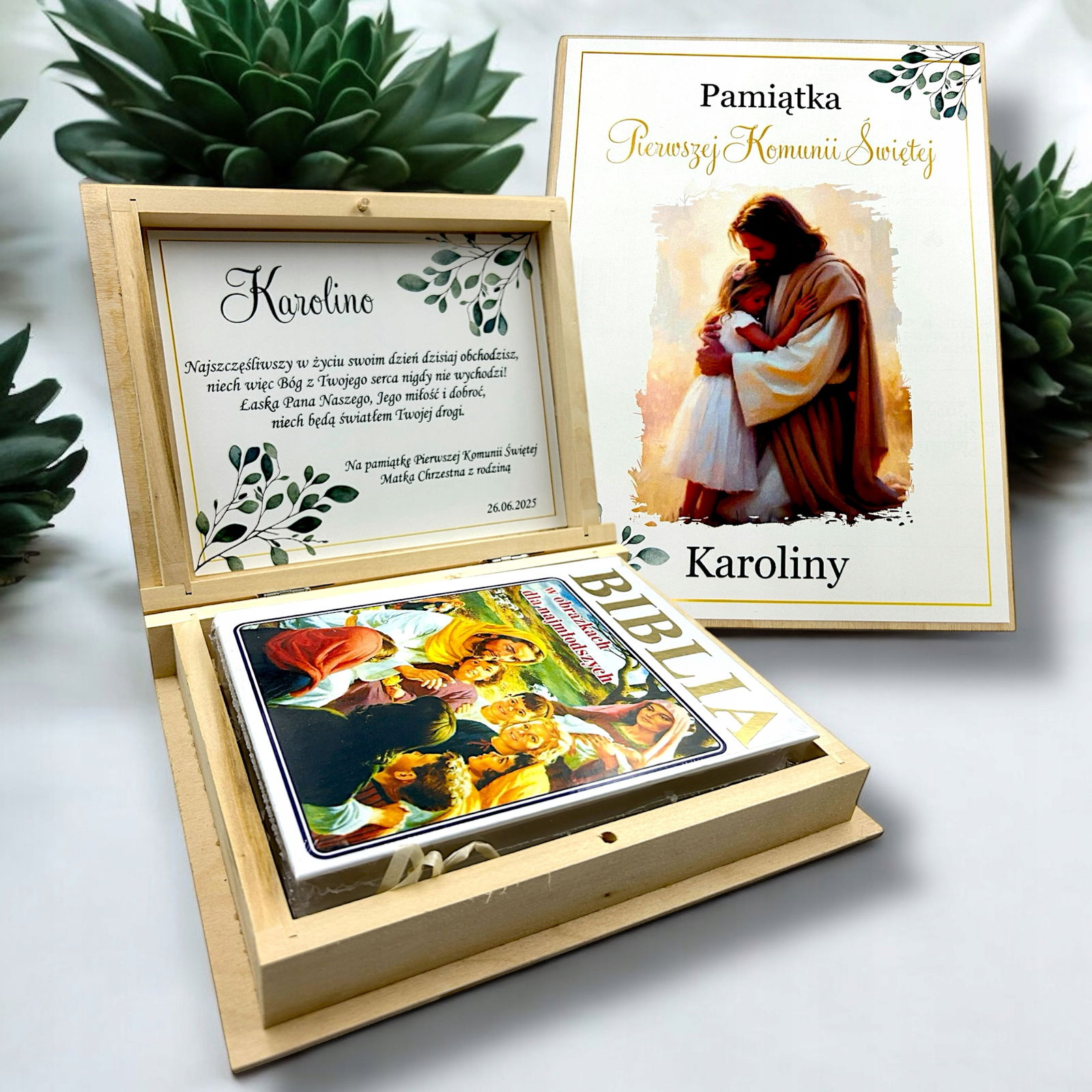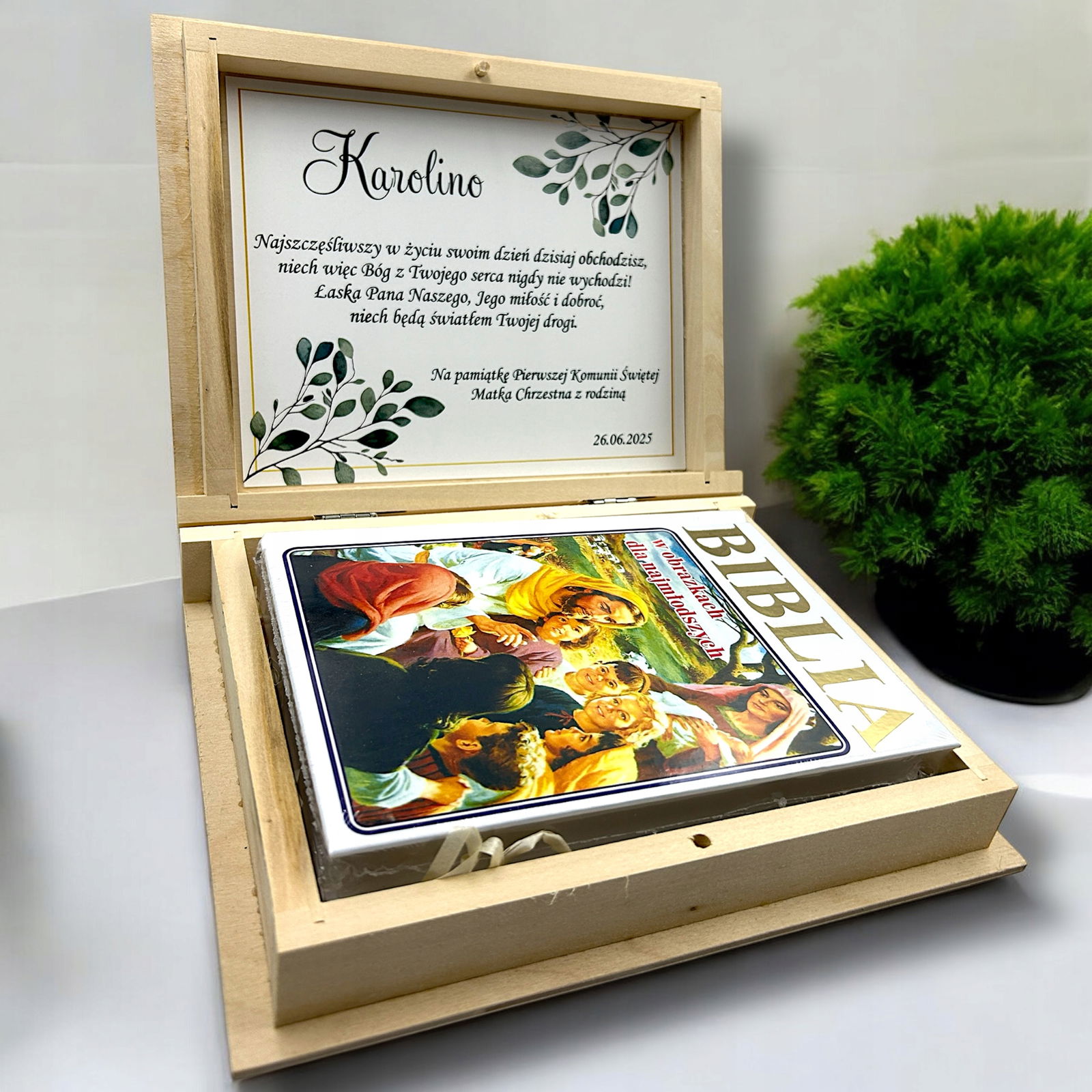 Biblia prezent na komunię Pismo Święte Pierwsza Komunia Pudełko Grawer RU1