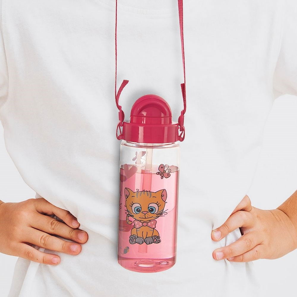 DZIECIĘCA - Butelka ze słomką oraz uszczelką o pojemności 490 ml w formie wygodnego bidonu. Butelka posiada motyw kotka. Butelka ma wysokość 20 cm a średnicę 7 cm. W zestawie również pasek do zawieszenia butelki.