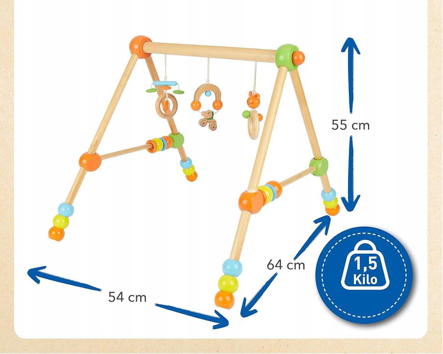 Ten uroczy, drewniany stojak do zabawy to idealna pierwsza zabawka motoryczna dla noworodków i małych dzieci. Stworzony z myślą o rozwoju koordynacji ręka-oko, pobudza wyobraźnię i zachęca do aktywnej zabawy. Dzięki mobilnej konstrukcji można go łatwo przenosić, tworząc przestrzeń do zabawy w dowolnym miejscu.