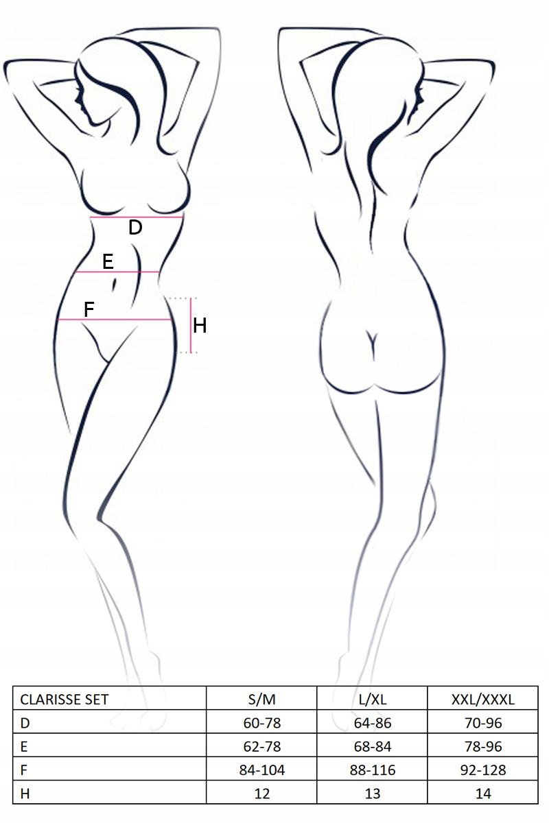 Czy czarny Clarisse set może być klasyczny? Tak, jeśli mówimy o elegancji. Ale czy jednocześnie może być wyzywający i nieprzyzwoicie seksowny? Oczywiście! Biustonosz typu „open bra”, czyli z otwartą częścią biustonosza wzmocniony fiszbinami uwydatnia piersi i podkreśla kobiecy dekolt, z kolei pas i majtki podkreślają kobiecą talię uwypuklając najważniejsze walory kobiecego ciała. Obok takiego kompletu niemożliwym staje się przejść obok niego obojętnie.