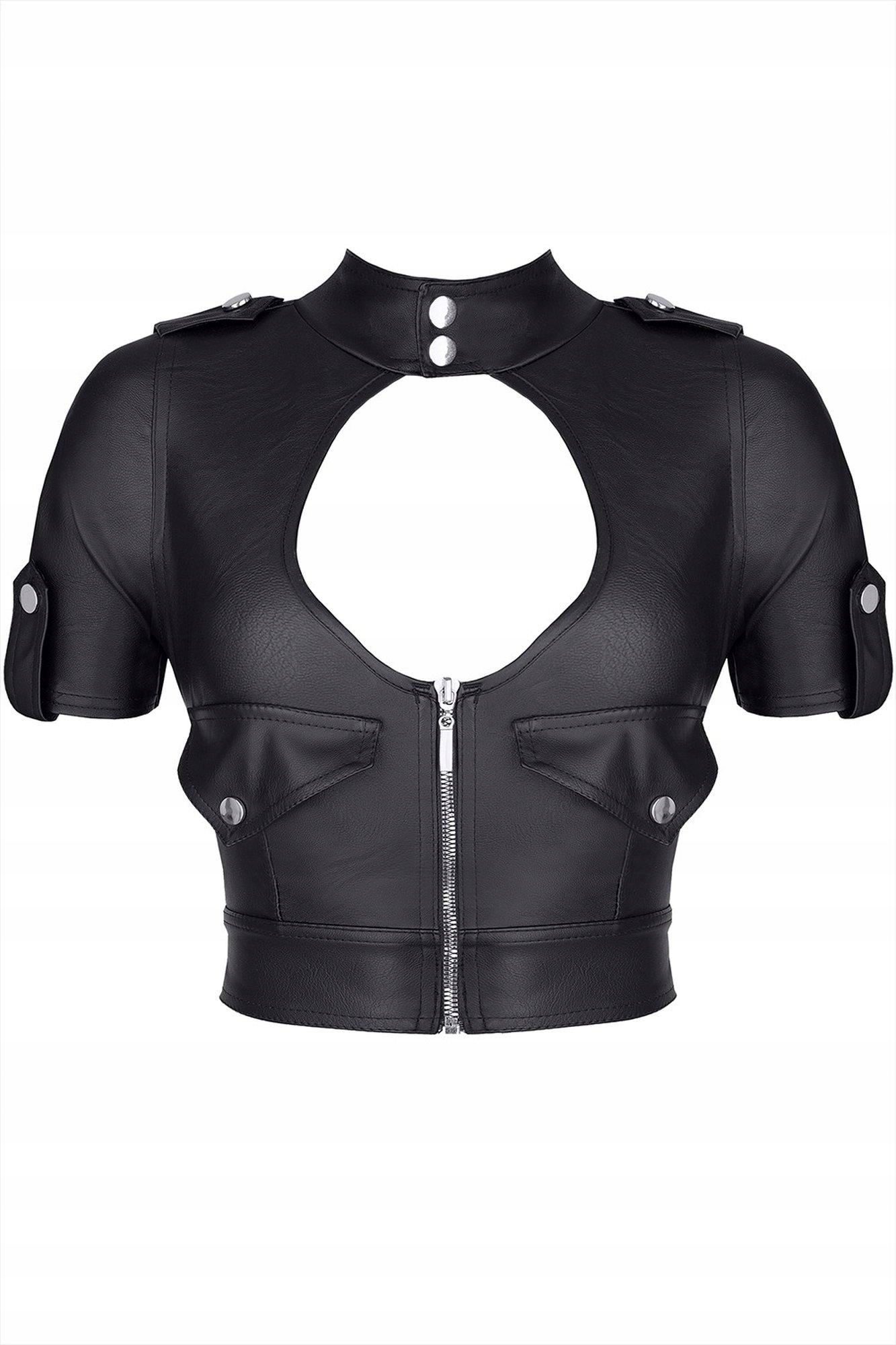 Top inspirowany stylistyką militarną. Wykonany z trwałej i elastycznej ekoskóry. Jej cechy powodują, że doskonale dopasowuje się do ciała, podkreślając jego kształt. Wyjątkowo efektownie prezentuje się okrągłe wycięcie na dekolcie. W dolnej części ozdobny srebrny zamek błyskawiczny z grawerowanym logo demoniq na suwaku. Militarny charakter podkreślają kiszenie oraz pagony na ramionach, ozdobione srebrnymi, metalowymi napami.