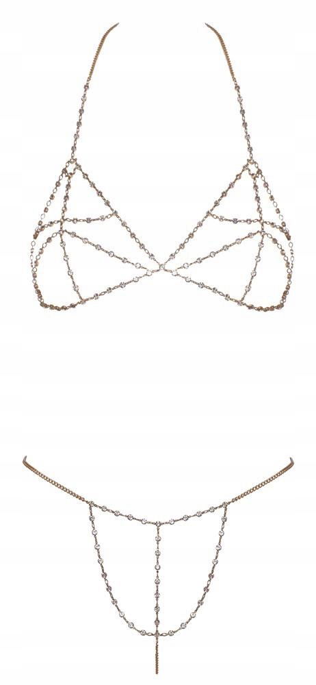Złociste bikini z łańcuszków od Cottelli ACCESSOIRES składa się z biustonosza i stringów. Nad piersiami i okolicą intymną biegną lśniące łańcuszki z kryształkami. Dodatkowo, stymulujący łańcuszek przebiega przez krocze, aż do górnej części pośladków. Łańcuszki na szyi, plecach oraz stringach można regulować i dostosowywać za pomocą zapięć na haczyki.