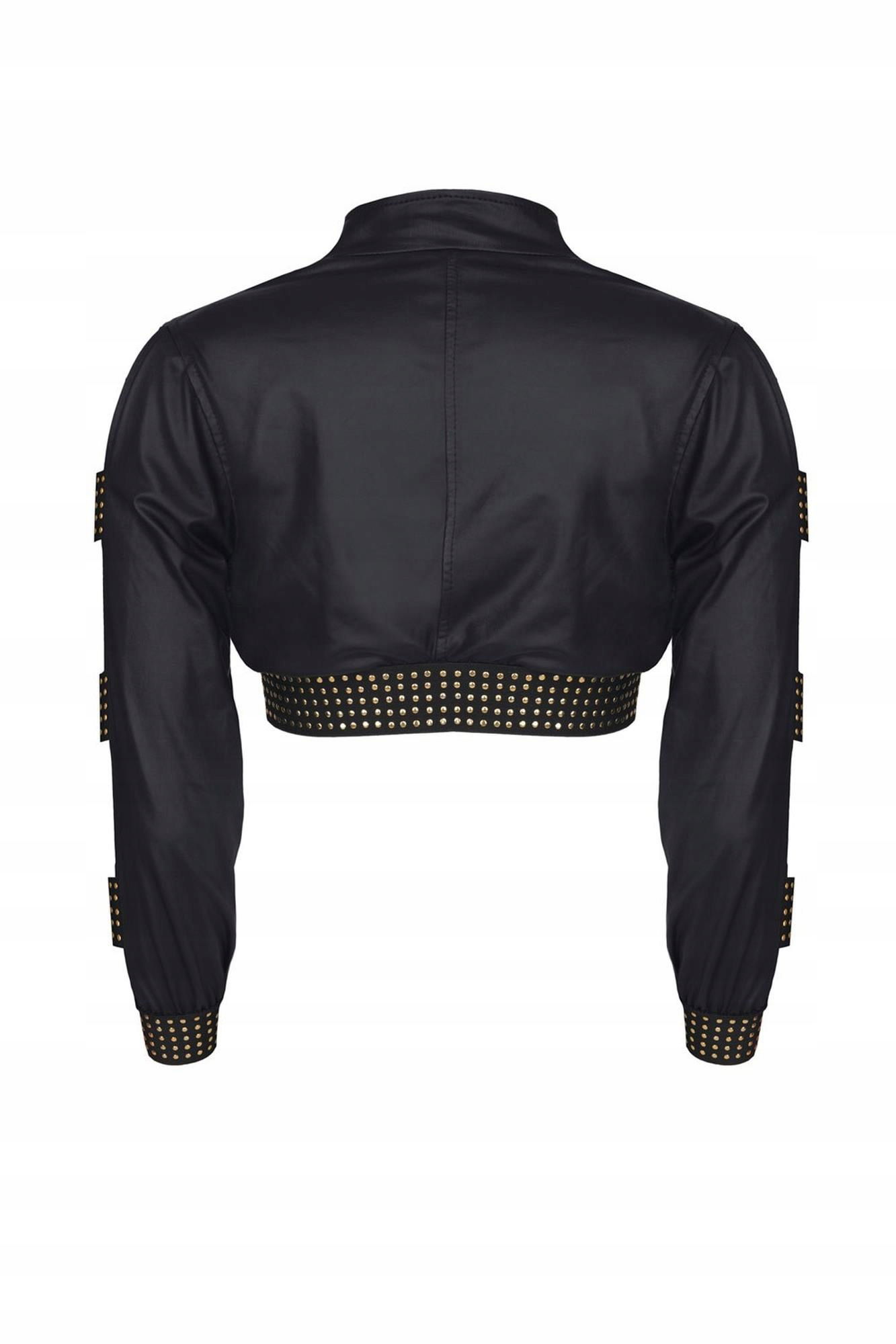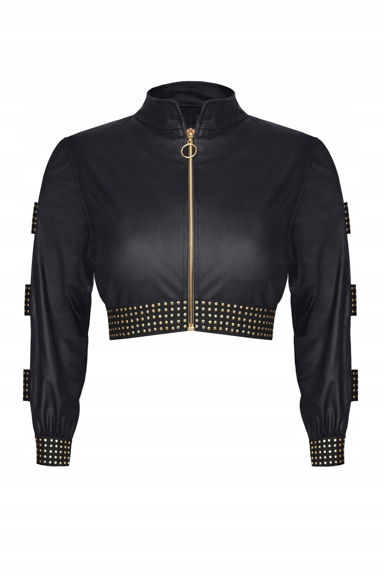 Intrygująco seksowna kurtka inspirowana modą lat 90-tych. Z przodu ozdobny element, to złoty zamek błyskawiczny z okrągłą i metalową zawieszką, także w kolorze złotym. Długie rękawy posiadają ozdobne wstawki z czarnej gumki ze złotymi aplikacjami. Znajduje się ona także na obwodzie w dolnej części kurtki.