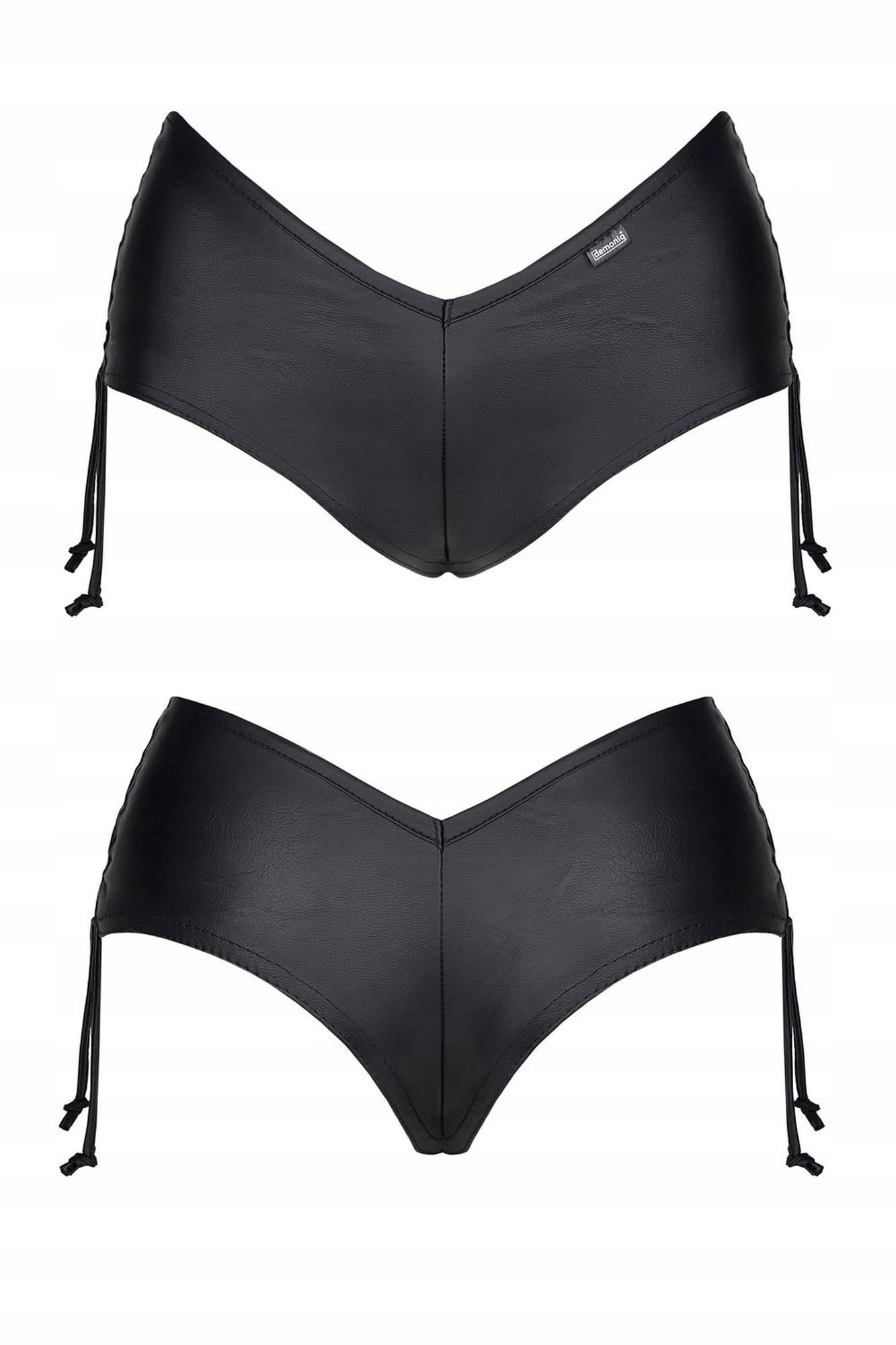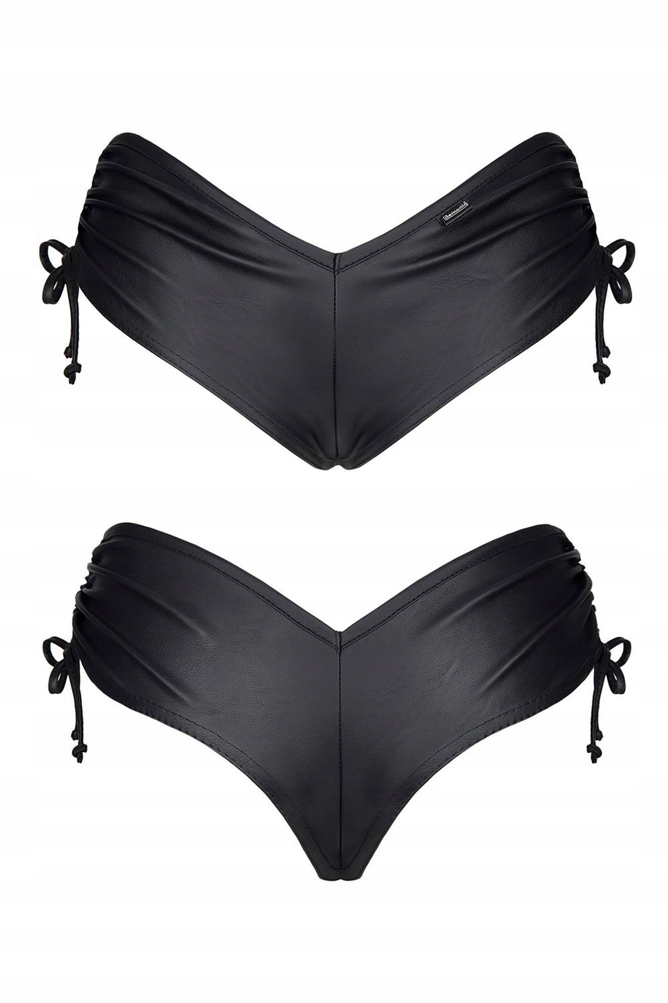 Z przodu i tyłu wyróżnia je w linii pasa kształt trójkątów, a z boków pionowe sznureczki ściągające. Z tyłu zachwyca wygląd ponętnych pośladków, uwypuklony specjalnie profilowanym krojem.