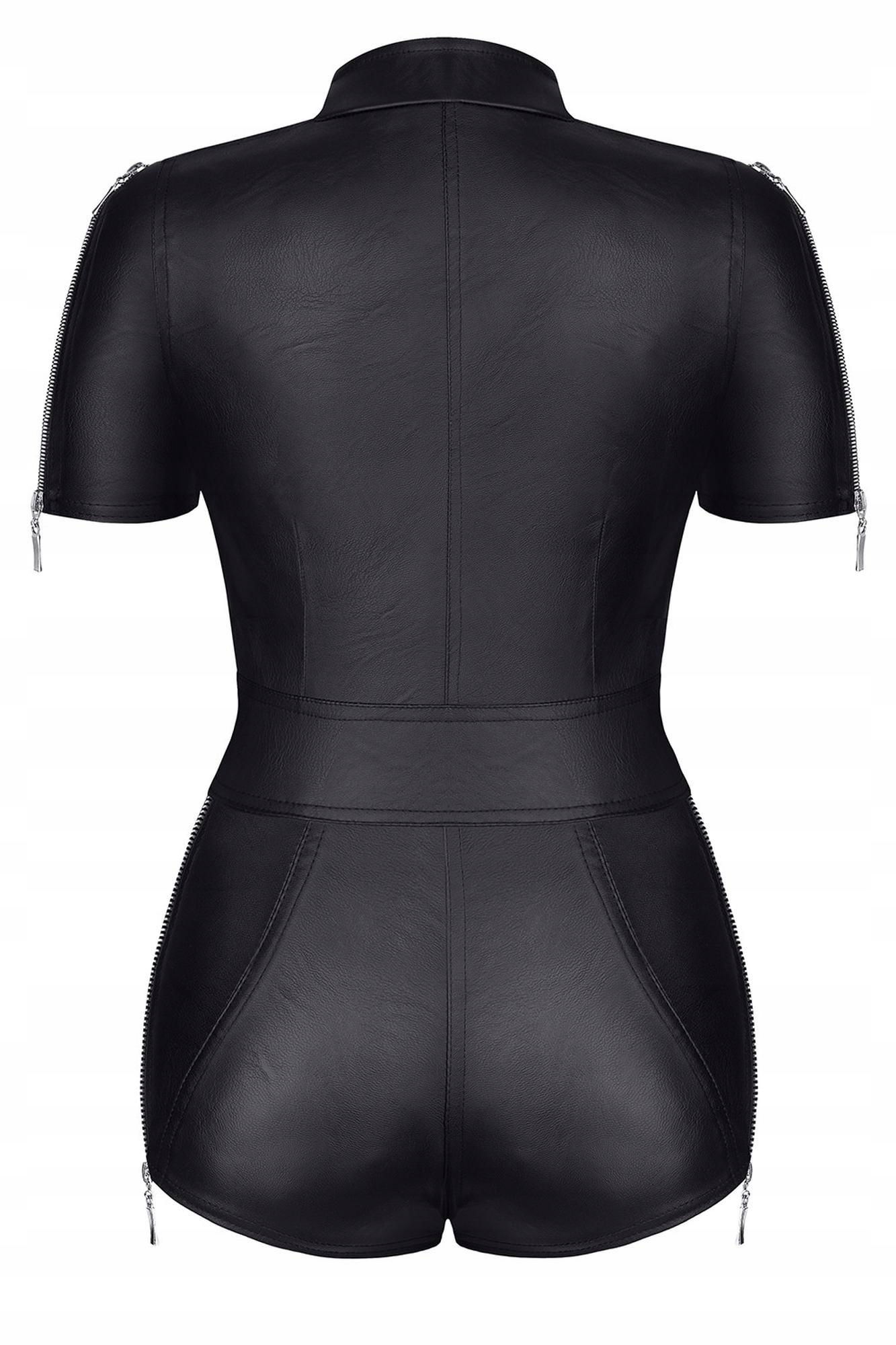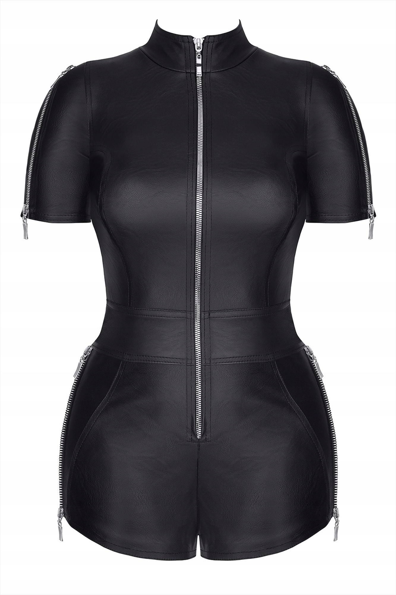 Efektowny kombinezon z elementami militarnymi, wykonany z trwałej i elastycznej ekoskóry. Posiada 4 ozdobne zamki błyskawiczne. Odpinane z 2-u stron na ramionach i biodrach. Dzięki nim ramiona można odkryć, a odpięcie na biodrach umożliwia dostęp do ukrytych części ciała.