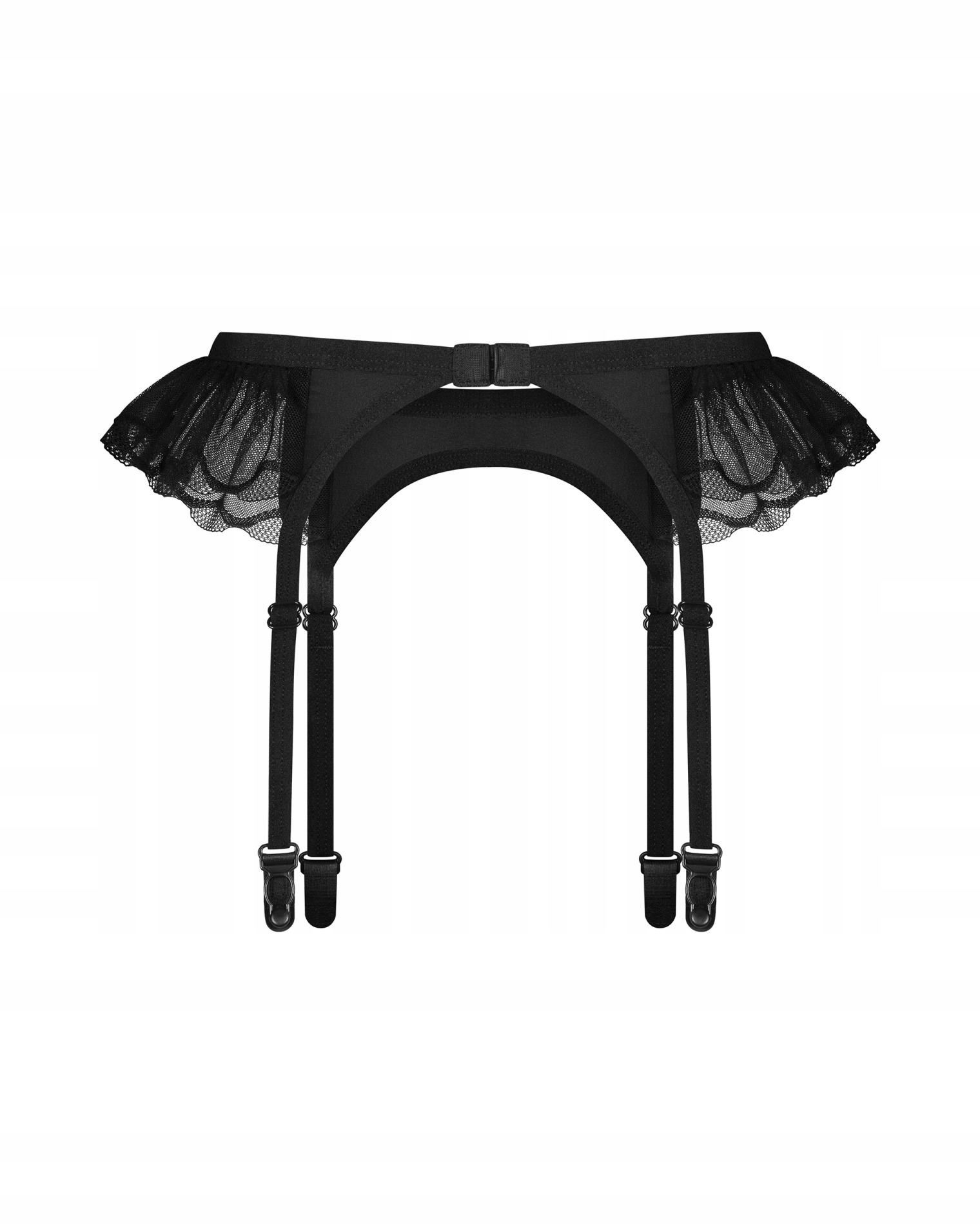 Tiulowa falbanka dodaje lekkości, a głęboka czerń podkreśla wyrafinowany charakter bielizny. Regulowane paski umożliwiają idealne dopasowanie pończoch, zapewniając wygodę i stabilność. Z tyłu znajduje się kilkustopniowe zapięcie, które pozwala na precyzyjne dopasowanie do sylwetki.