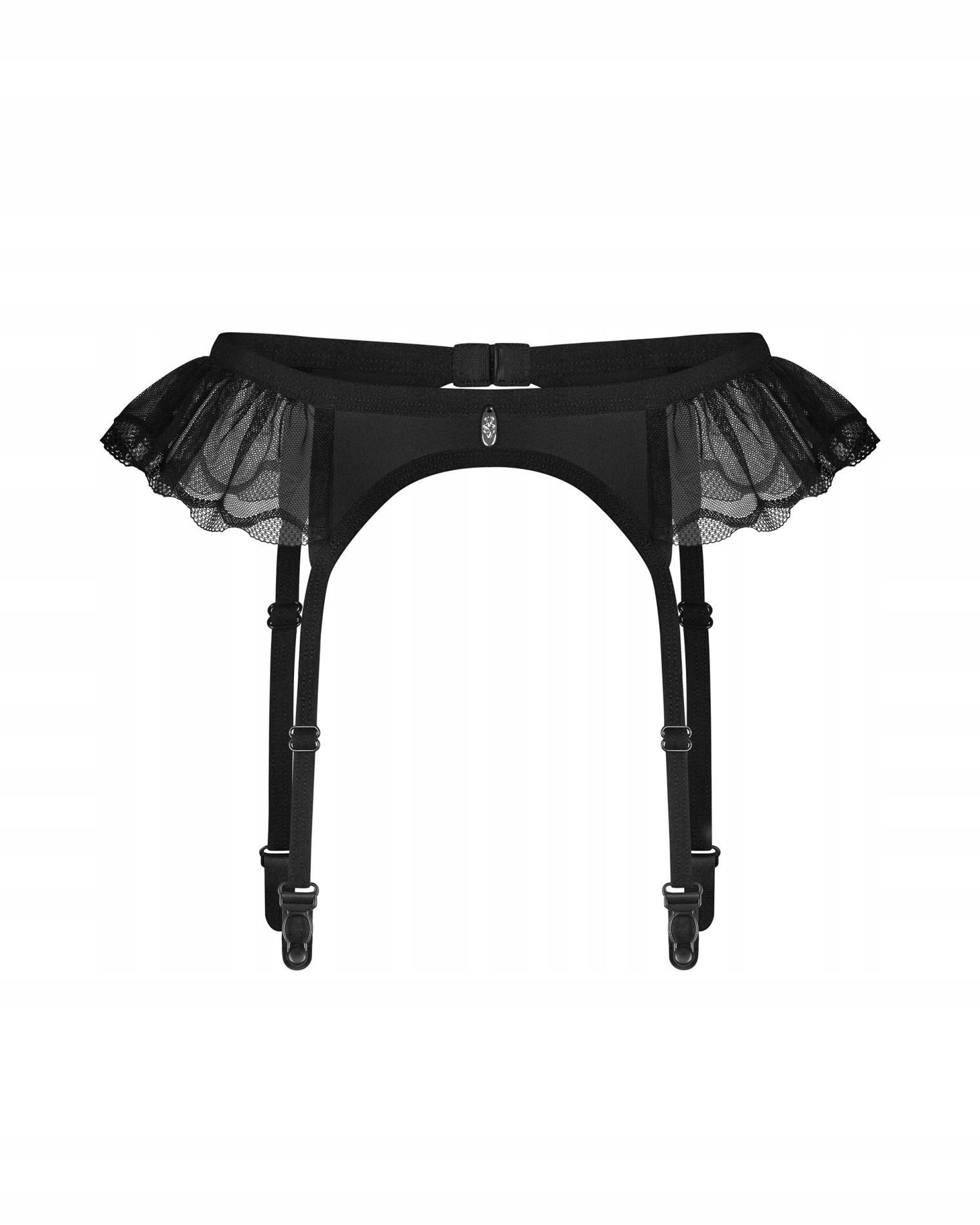 Tiulowa falbanka dodaje lekkości, a głęboka czerń podkreśla wyrafinowany charakter bielizny. Regulowane paski umożliwiają idealne dopasowanie pończoch, zapewniając wygodę i stabilność. Z tyłu znajduje się kilkustopniowe zapięcie, które pozwala na precyzyjne dopasowanie do sylwetki.