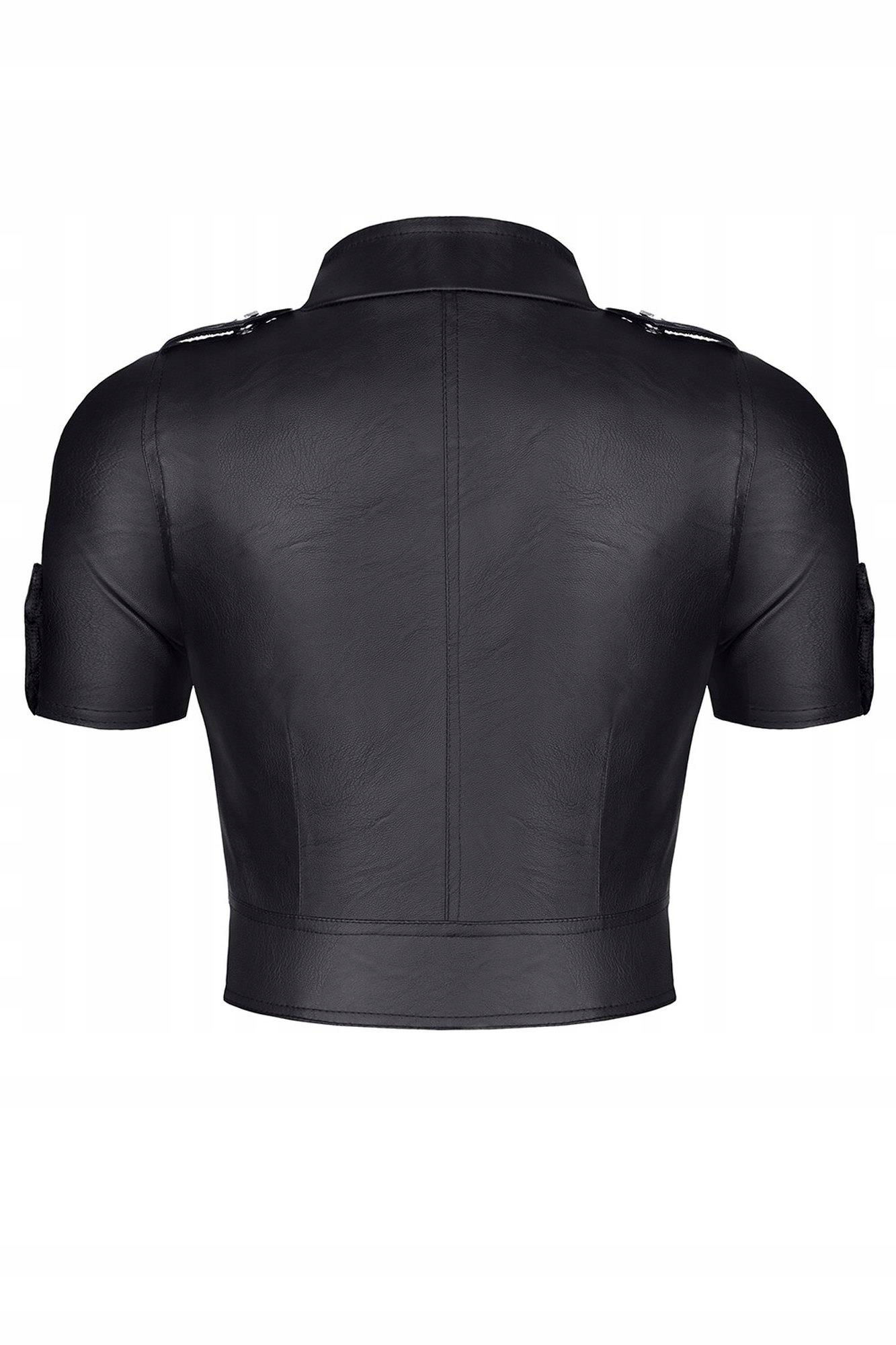 Top inspirowany stylistyką militarną. Wykonany z trwałej i elastycznej ekoskóry. Jej cechy powodują, że doskonale dopasowuje się do ciała, podkreślając jego kształt. Wyjątkowo efektownie prezentuje się okrągłe wycięcie na dekolcie. W dolnej części ozdobny srebrny zamek błyskawiczny z grawerowanym logo demoniq na suwaku. Militarny charakter podkreślają kiszenie oraz pagony na ramionach, ozdobione srebrnymi, metalowymi napami.