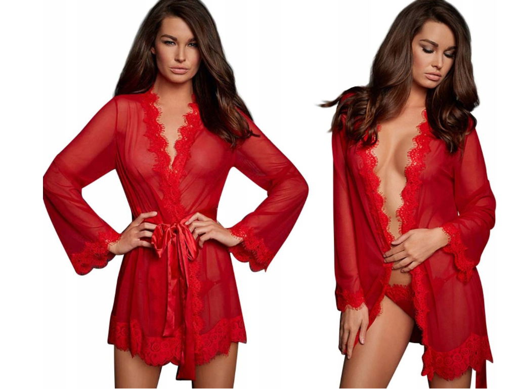 Piękna bielizna erotyczna. Czerwony, prześwitujący szlafrok + stringi. Komplet bielizny damskiej. Idealnie układa się na ciele kobiety pokazując jej wszystkie walory. Bielizna damska, która nadaje kobiecemu ciału seksapilu. Seksowna bielizna dla dorosłych. Jest to doskonały pomysł na prezent. Peniuar, Tiul.