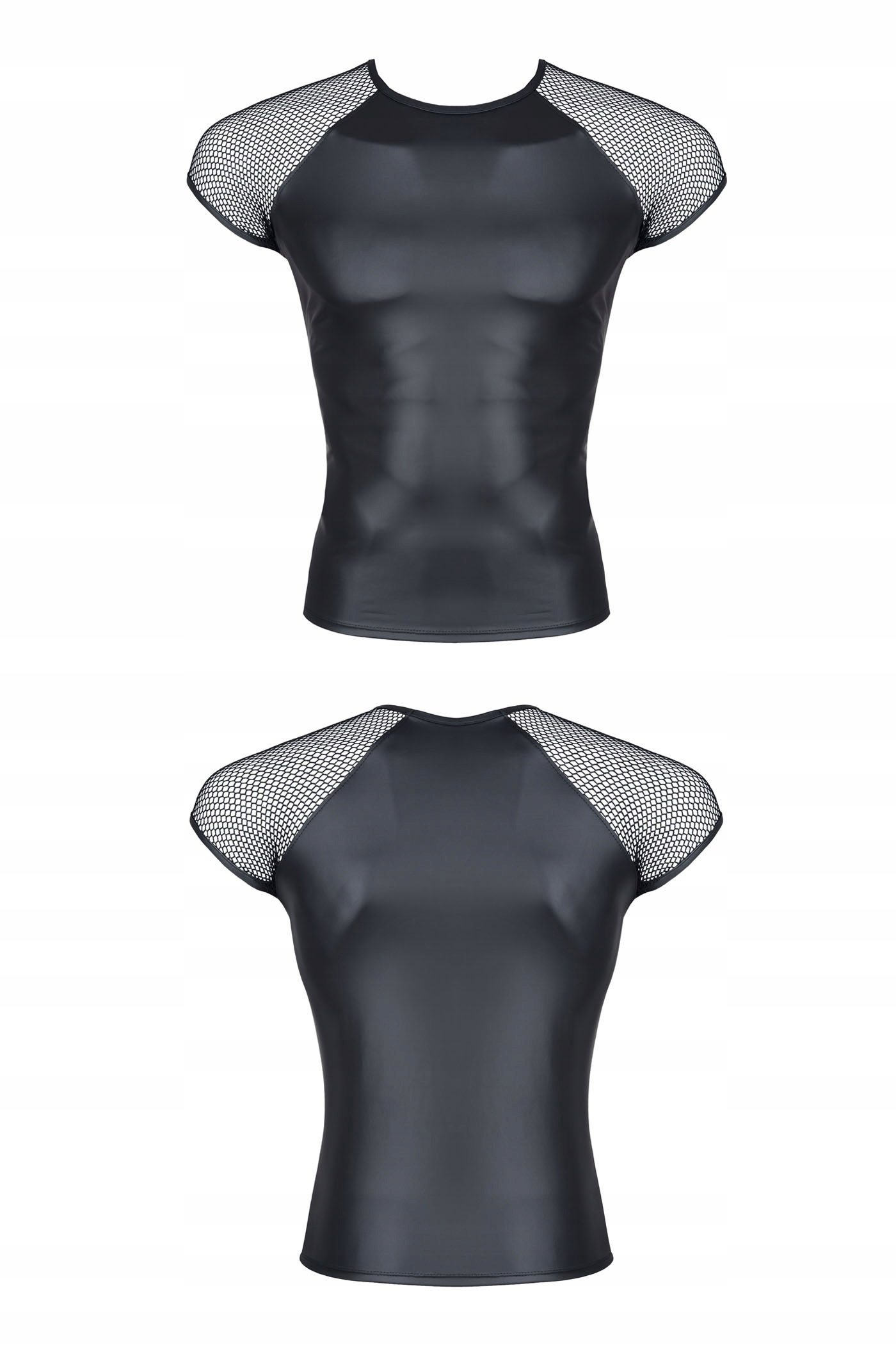 Koszulka z czarnego, elastycznego wetlook"a z rękawami z czarnej siateczki. Rękawki obszyte czarnym elastycznym wetlook"iem. Dzięki elastycznym właściwościom materiału, koszulka doskonale przylega do ciała podkreślając jego walory. Rękawki z czarnej siateczki optycznie poszerzają ramiona.
