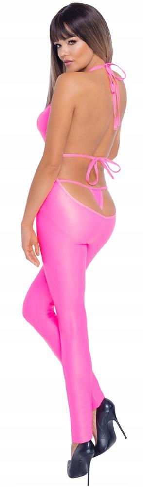 Jumpsuit wraz ze stringami Rio marki Cottelli PARTY w kolorze neonowego różu z matowym połyskiem. Kombinezon z długimi nogawkami jest z przodu wycięty bardzo nisko, aż do pępka. Dekolt typu halter można zawiązać, podobnie jak pasek w talii na plecach, który jest wycięty do samego dołu. Miękki, elastyczny materiał zapewnia doskonałe dopasowanie i wysoki komfort noszenia.