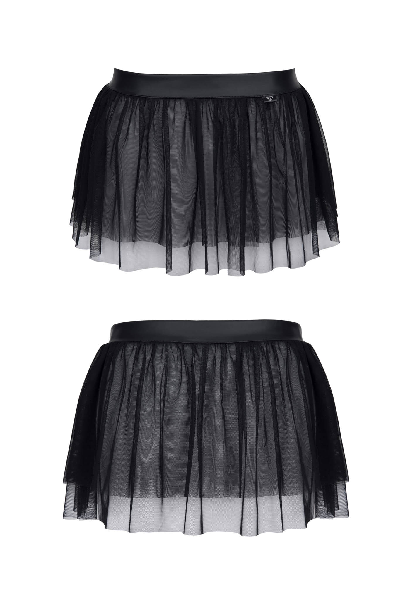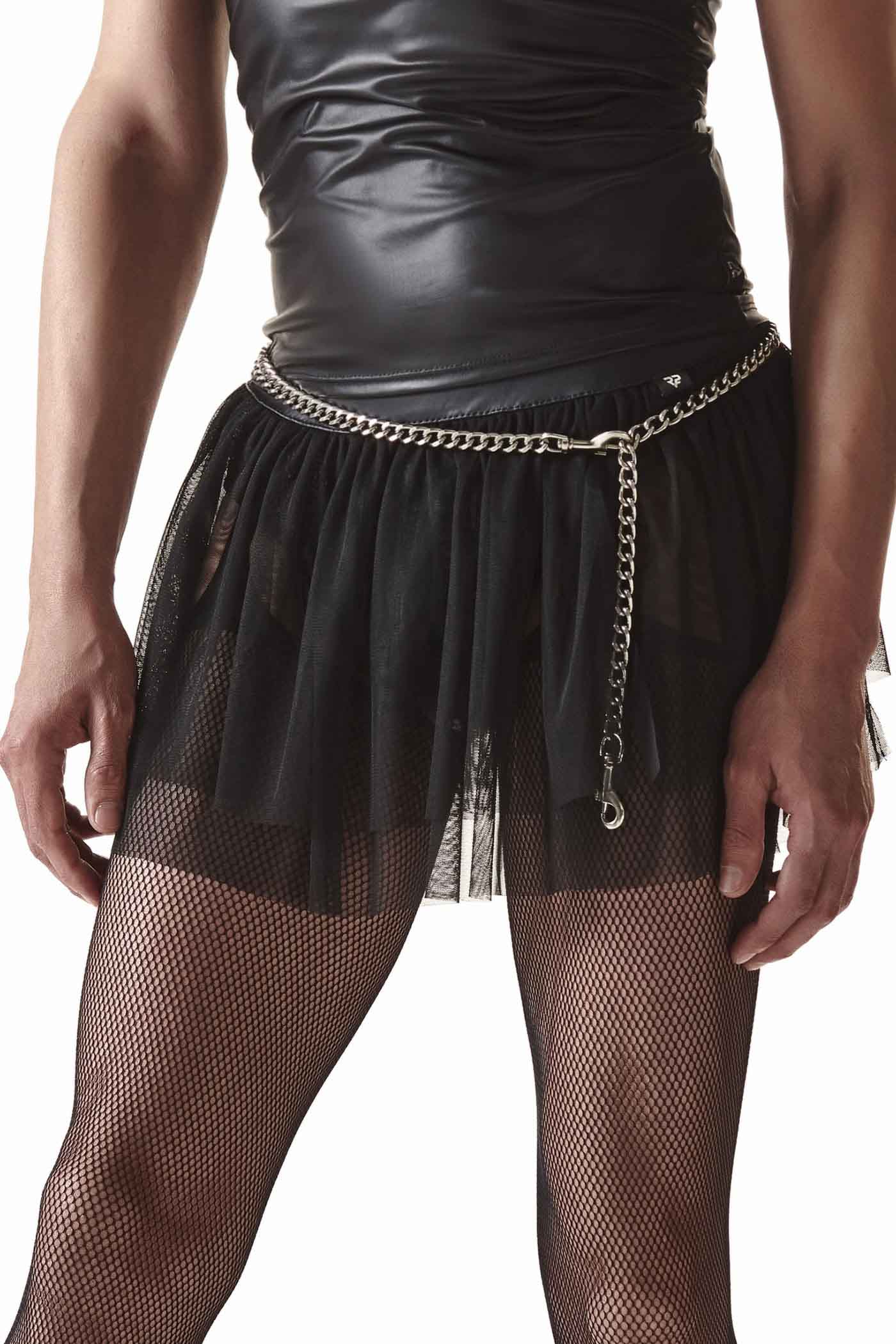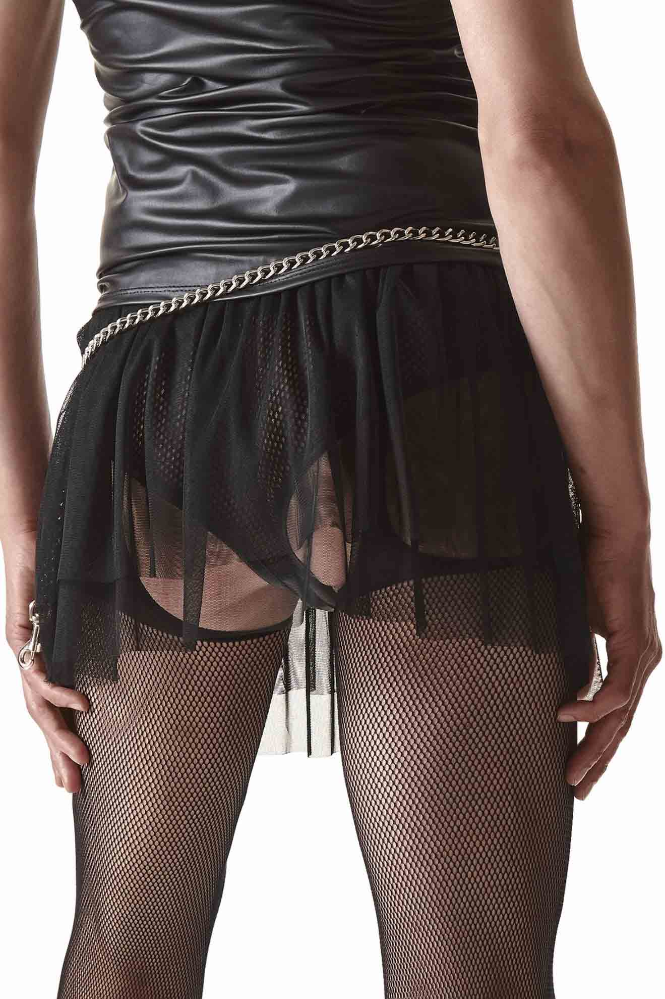 Krótka mini spódniczka w całości wykonana z czarnej siateczki z drobnymi oczkami. W górnej części pasek czarnego wetlooka"a z elastyczną gumką - ułatwiający dopasowanie. Spódniczka efektownie się prezentuje dzięki licznym warstwom siateczki pięknie układających się na biodrach i pośladkach. Łańcuszek widoczny na zdjęciu nie jest częścią spódniczki.