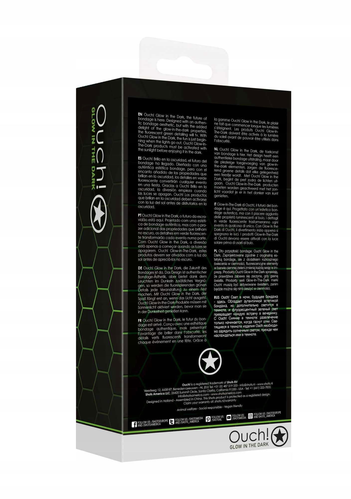 Oto przyszłość bondage: Ouch! Glow in the Dark. Zaprojektowane zgodnie z oryginalną estetyką bondage, ale z dodatkiem rozkosznego świecenia w ciemności, fluorescencyjne elementy w barwie ciemnej zieleni zmienią każdą sesję w imprezę.