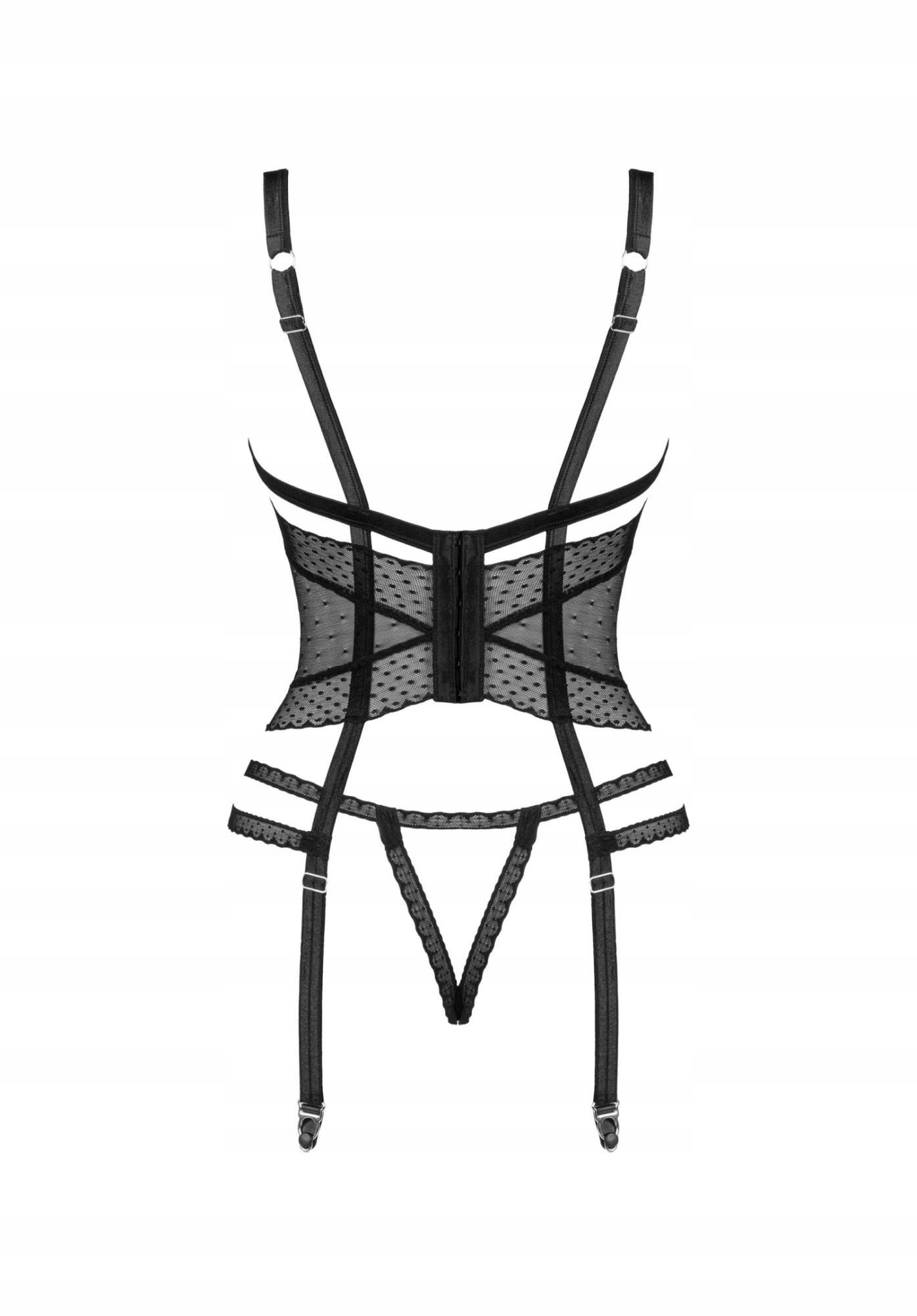 Zmysłowy gorset Lanelia podkręci Wasz romantyczny wieczór we dwoje! Seksowne paseczki w połączeniu z delikatną, prześwitującą siateczką to kombinacja warta grzechu, a otwarty krój pozwala na jeszcze więcej figlarnych przyjemności. Jeśli chcesz podgrzać atmosferę w łóżku, dodaj go do swojej kolekcji już teraz!Poznaj więcej szczegółów:- czarny gorset Lanelia - seksownie prześwitująca siateczka – pobudza zmysły- biustonosz o otwartym kroju – więcej pikanterii- regulowane ramiączka – idealne dopasowanie- srebrna zawieszka na biuście – przyciąga uwagę i dodaje elegancji- zapięcie na haftki na plecach - paski do pończoch z możliwością regulacji – wygoda noszenia- stringi z otwartym krokiem – rozkosz w wersji max!- miły w dotyku materiał (85% poliamid, 15% elastan)