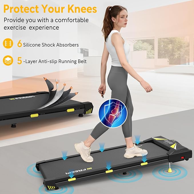 Wielopoziomowa amortyzacja wstrząsów: bieżnia wyposażona jest w 5-warstwowy antypoślizgowy pas bieżny i 6 silikonowych amortyzatorów, które skutecznie redukują obciążenie stawów, chronią kolana, a powierzchnia pasa do ćwiczeń wynosi 100*40 cm, co zapewnia swobodną i wygodną przestrzeń do biegania.