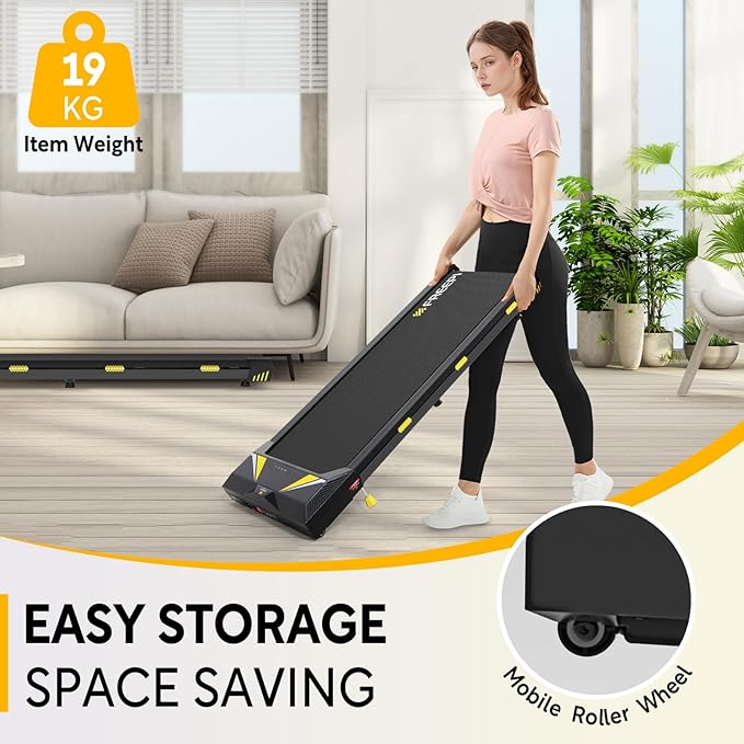 Brak instalacji i oszczędność miejsca: Ta przenośna bieżnia jest zmontowana i gotowa do użycia po wyjęciu z pudełka. Waga bieżni wynosi zaledwie 19 kg, rozmiar to tylko 120*49*11,45 cm, a wbudowane kółko transportowe można łatwo przesuwać i przechowywać.