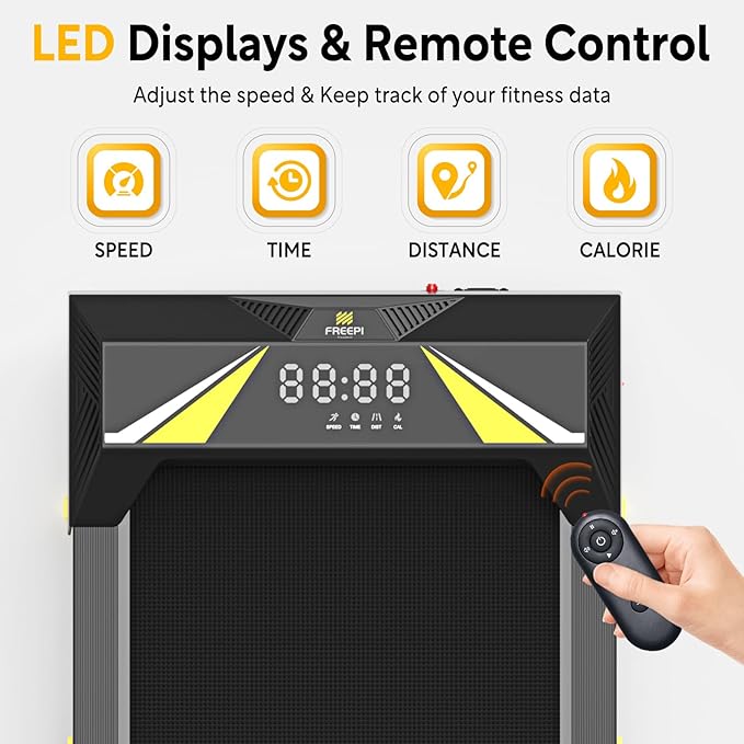 Wyświetlacz LED i pilot zdalnego sterowania: Ta bieżnia pod biurko wyraźnie wyświetla i śledzi dane za pomocą wyświetlacza LED, pokazując prędkość, dystans, kalorie, czas. Ponadto możesz regulować prędkość i sterować maszyną do chodzenia za pomocą pilota zdalnego sterowania.
