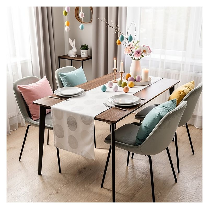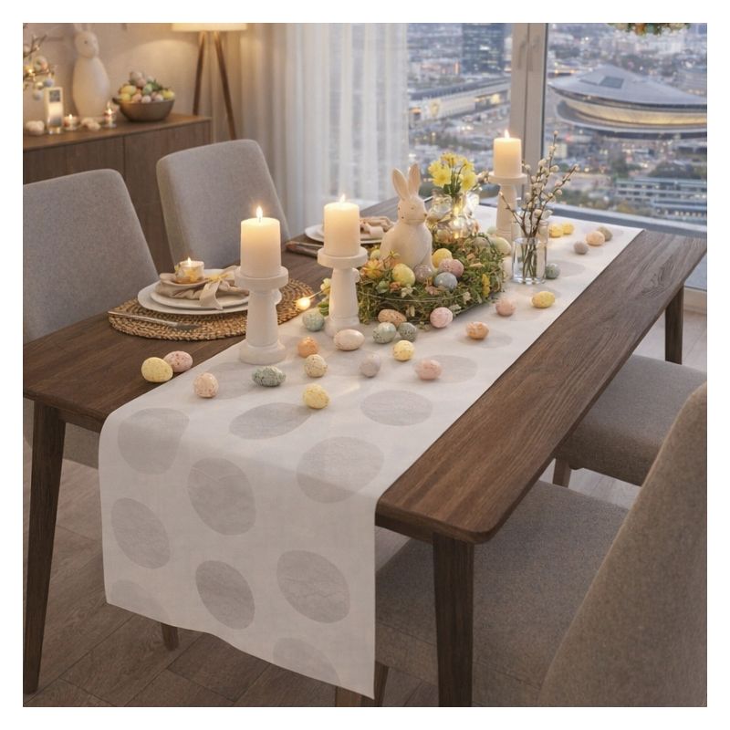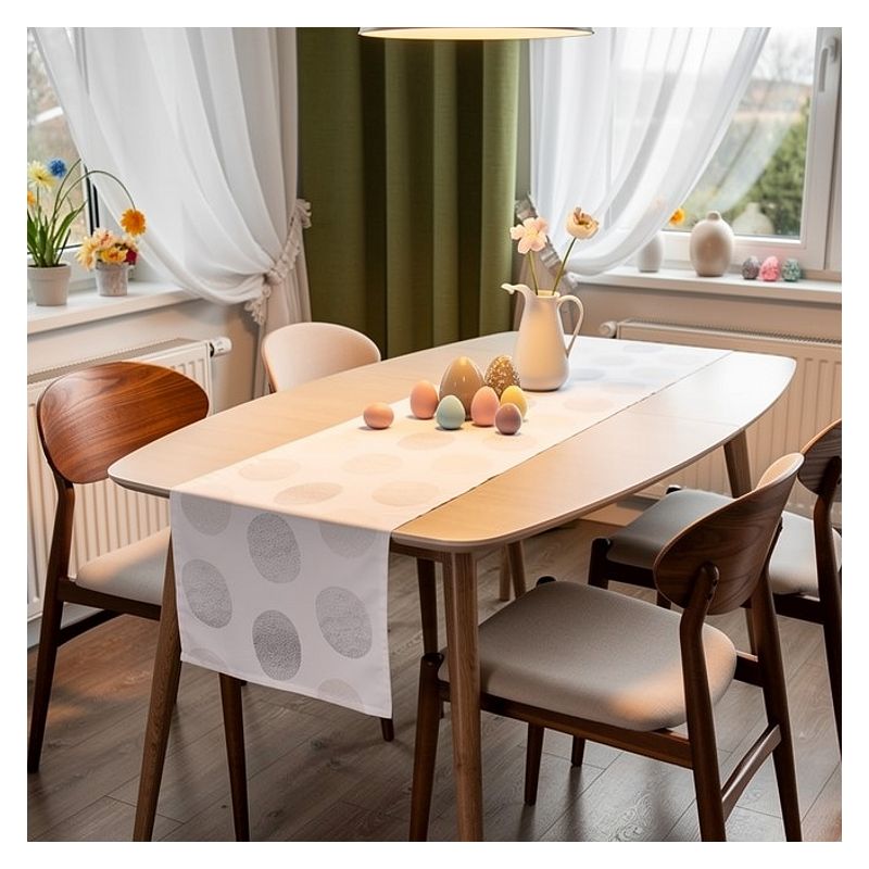 Świąteczny bieżnik Białe Pisanki w rozmiarze 40 x 140 cm to połączenie elegancji, tradycji i wysokiej jakości wykonania, które sprawi, że stanie się on atrakcyjnym elementem Twojej wielkanocnej aranżacji stołu.