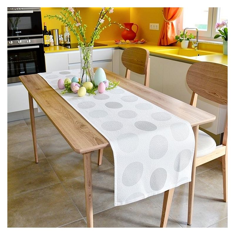 Biały bieżnik ozdobiony jest ponadczasowym motywem wielkanocnych pisanek, który nawiązuje do tradycji świątecznych i zapewni przyjemną atmosferę przy Twoim stole.