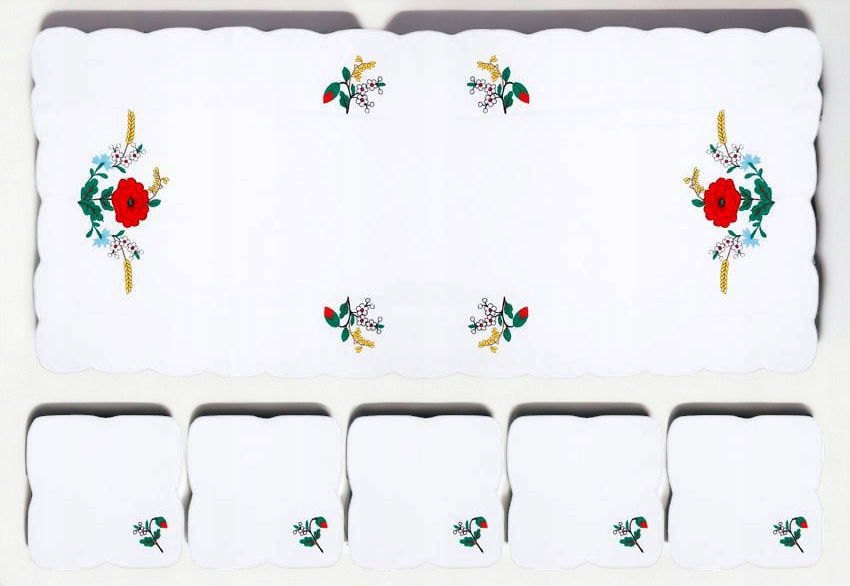 Elegancki, ręcznie haftowany komplet składający się z bieżnika z kociewskim haftem wraz z 6 serwetkami także z akcentami kociewskimi, piękna ozdoba Twojego domu, podkreślająca regionalny charakter. Haft kociewski z Pomorza nazywany jest haftem ziemi ze względu na obecność w nim dużej ilości atrybutów roślin z pól i łąk: maków, chabrów, kłosów itp.