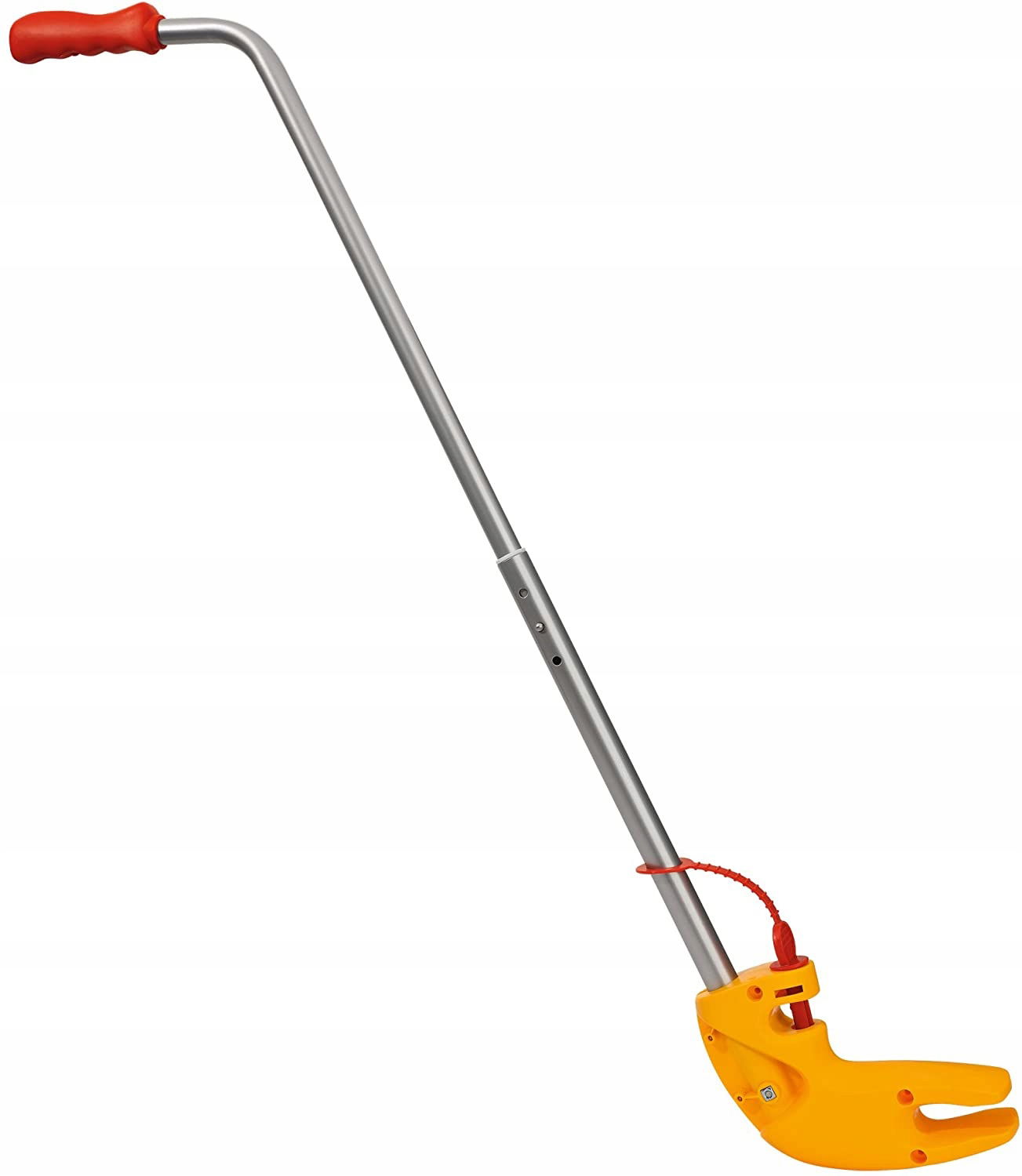 BIG-PUSH-POLE ma 3 różne ustawienia wysokości i jest po prostu zaczepiony do tylnej metalowej osi na spodzie BIG-BOBBY-CAR. Czerwony kołek zabezpieczający służy do bezpiecznego zamocowania i dodatkowo mocuje popychacz do złącza przyczepy w BIG-BOBBY-CAR.