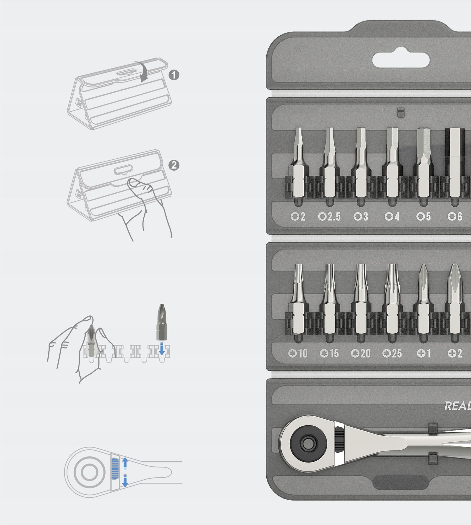 - Materiał narzędzi: Stal S2 (końcówki), Stal Nierdzewna (grzechotka)