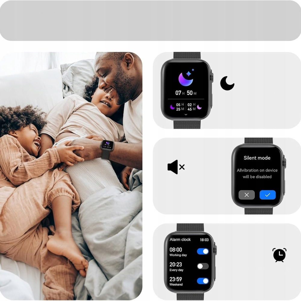 - Sport i aktywność:Ponad 100 trybów sportowych (bieganie, jazda na rowerze, joga, piłka nożna i inne)Licznik kroków, kalorii, dystansu, czasu aktywności