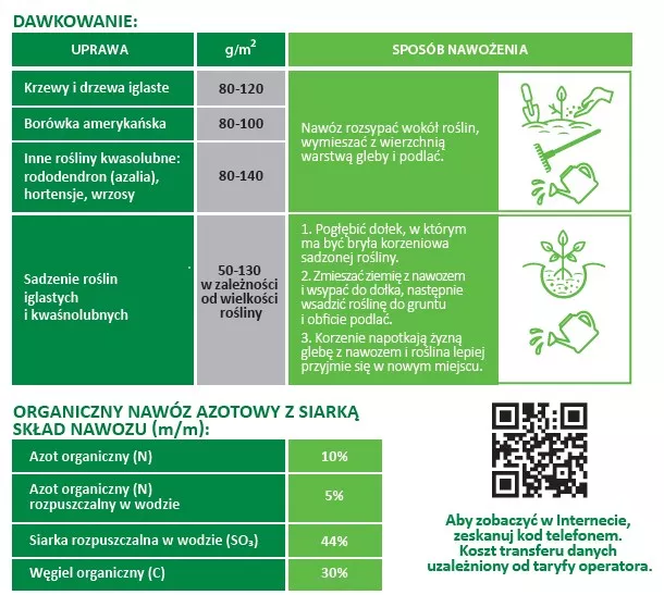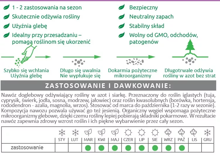 BiOgardena nawóz doglebowy do roślin iglastych i kwasolubnych jest przeznaczony do nawożenia roślin preferujących niskie pH gleby, np. tui, świerków, jałowców, jodły, choiny, cyprysików, modrzewi, sosen, rododendronów, azalii, wrzosów, hortensji czy borówek. Dostarcza roślinom azot organiczny i siarkę elementarną.