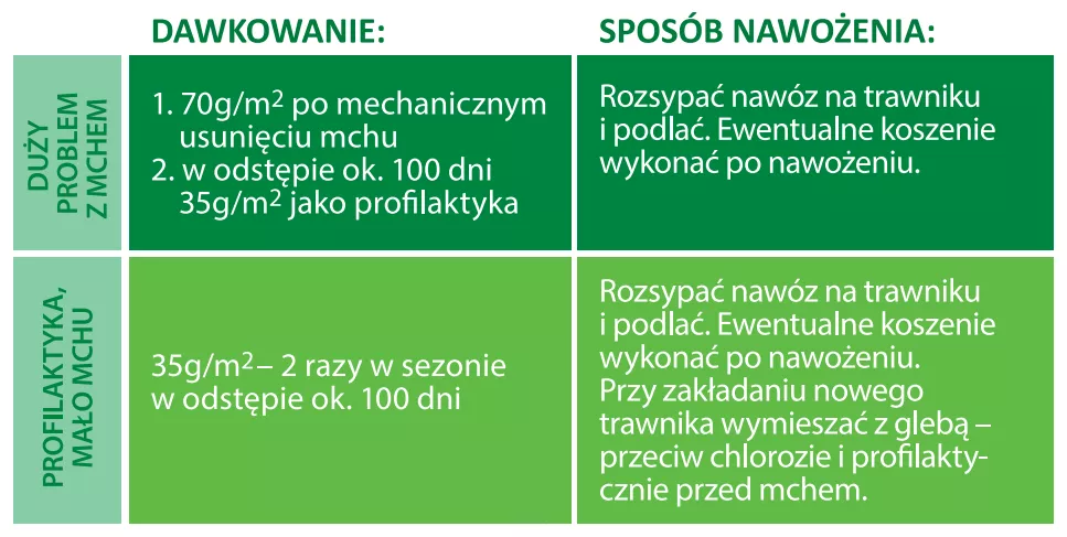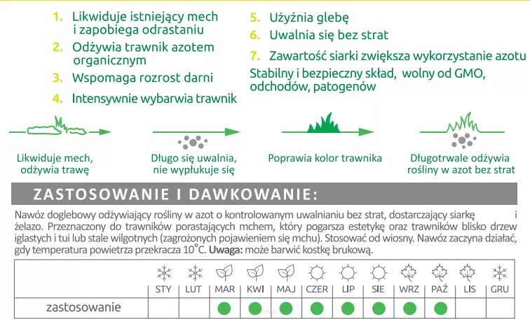Organiczny nawóz Anty Mech BiOgardena działa przez 100 dni i wystarcza na ok. 200 m² trawnika. Jest przeznaczony do trawników porastających mchem oraz zagrożonych pojawieniem się mchu (zacienionych, stale wilgotnych, położonych w pobliżu drzew iglastych i tui). Można stosować go od wiosny do jesieni.