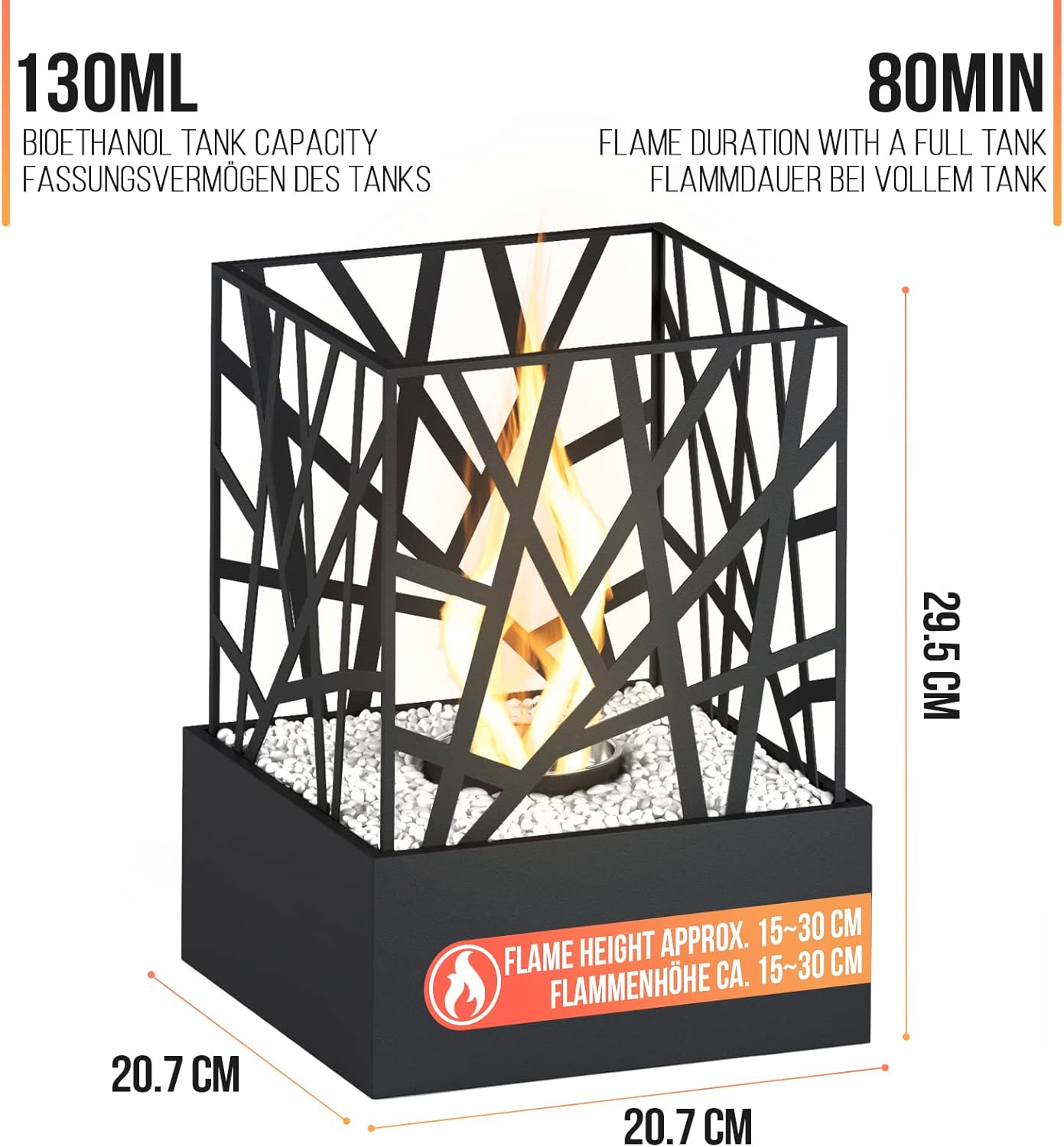 Kominki zazwyczaj wymagają dużej konserwacji, ale te kominki stołowe są bardzo łatwe w utrzymaniu: nie wytwarzają sadzy ani brudu. Atmosfera naszej pieca bioetanolowego jest idealna na randki lub rodzinne wieczory na tarasie. Przenośne kominki nie wymagają instalacji do pracy, wystarczy napełnić zbiornik bioetanolem i cieszyć się ciepłymi i przyjemnymi wieczorami przy ognisku. Nasze kominki stołowe etanolowe mają dłuższą żywotność, ponieważ są wykonane z wysokiej jakości materiałów. Mały i łatwy do przenoszenia, ten kominek podłogowy idealnie pasuje do każdego stołu, wewnątrz i na zewnątrz